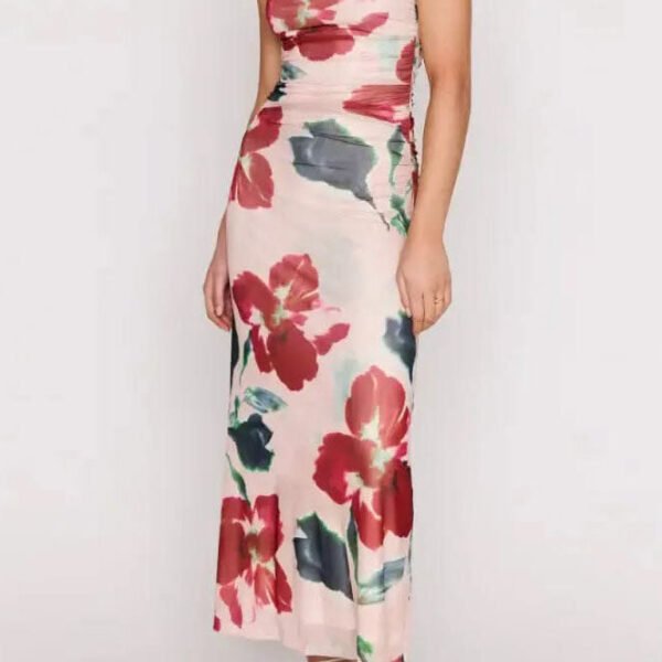 striking mesh midi dress in a sophisticated berry and pink floral pattern. lined dress has a sleeveless. form-fitting silhouette and features a high round neckline. midi-length skirt. and ruched sides for a flattering fit. lightweight dress is versatile and can be worn from spring into summer.?