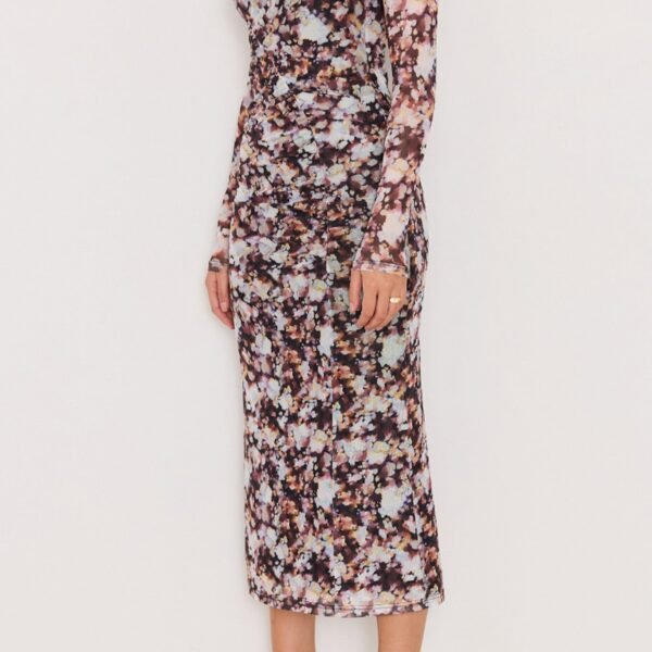 form-fitting midi dress made from a gorgeous floral mesh material. lined dress features a crew neckline. sheer long sleeves. and a ruched seam detail spanning from the waist to the bottom hem. giving dress a great. flattering fit. dress is perfect for any holiday gathering. but can also be worn into the spring and again in the fall.?