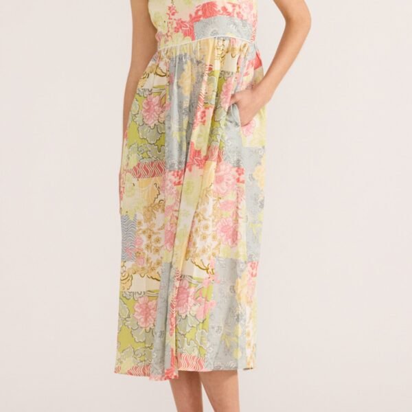 gorgeous midi dress in a patchwork-inspired floral print. dress is made from a quality linen blend with a nice hand feel. lined dress features thin adjustable straps. a smocked back with hidden zipper. gathered details on waist. side pockets. and a flowy midi length skirt. dress has a great fit and is perfect for special events this summer.?