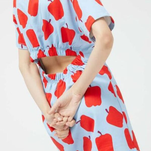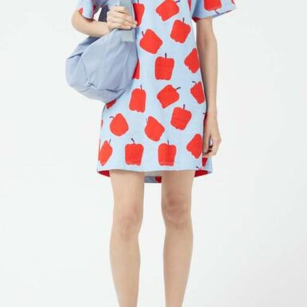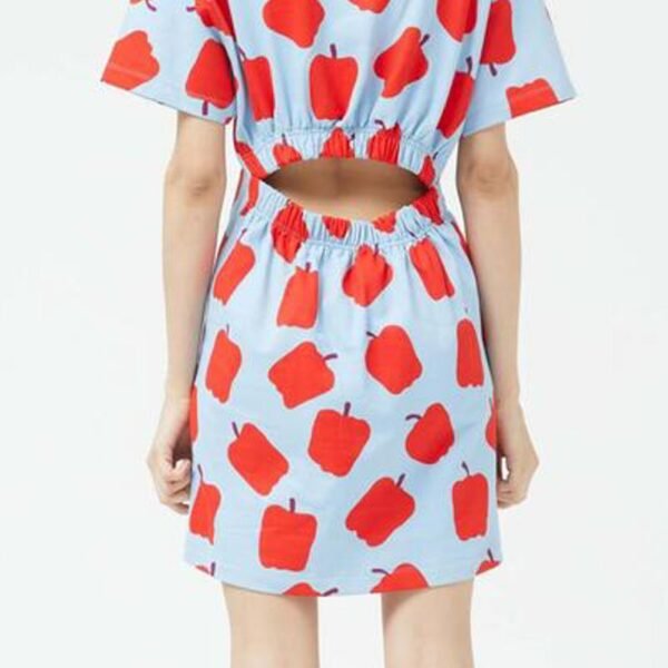 adorable shift dress in sky blue and bold red pepper print. soft and comfortable dress features a crew neckline. short sleeves. mini length skirt. and a bra-friendly peekaboo detail on back with elastic. elastic back cinches the waist in. giving dress a more defined shape. casual dress is a great throw on and go piece for wearing around town or on vacation this summer.??