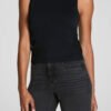 finely ribbed knit tank in blue-grey and white stripes. top features a crew neckline and a perfectly cropped length. tank is made from a thicker knit and has a contour fit. style this piece on its own in hot weather and then layer it as the weather cools.