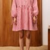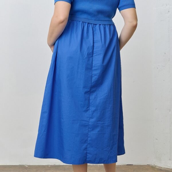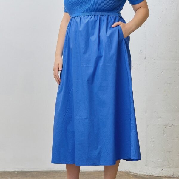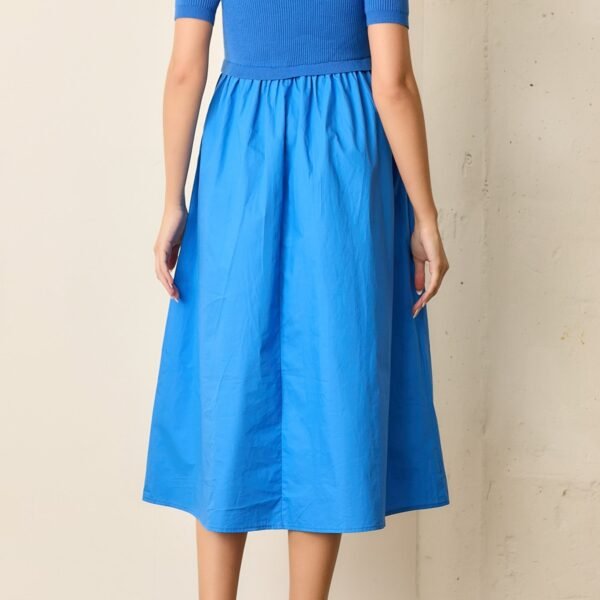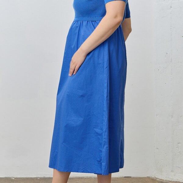 easy to wear mixed media dress in a bold saturated blue. which is a trendy color for fall. dress features a stretchy ribbed knit bodice with a scoop neckline and short sleeves. while the skirt is made from a crisp poplin-like material and features side pockets and a full silhouette. dress runs true to size and is available in an inclusive size range.?