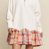 stay cool and classy in this lightweight blue plaid mini dress. lined dress features a crew neckline accented with a charming self-tie bow. button front closures. sheer three-quarter length sleeves with ties. and a flowy fit. easy to wear dress offer a nice blend of elegance and ease.?