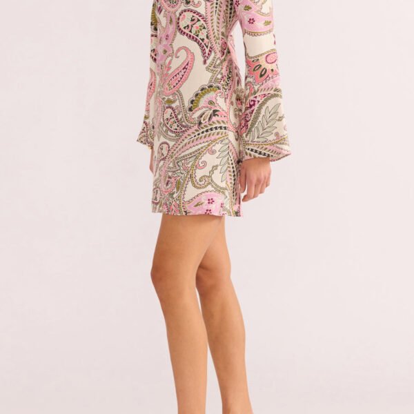 retro-feeling mini dress in a gorgeous and springy paisley print. bias cut dress has a unique shape with a high neckline. scoop neck and tie detail on back. and roomy bell sleeves. well made dress runs true to size. but fabric does not stretch and piece is more fitted in the bust.?