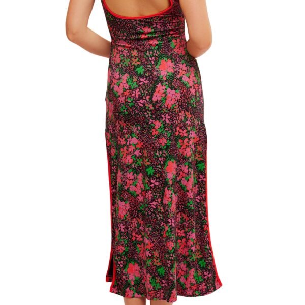 free people midi dress in black and pink floral pattern with coordinating red trim. dress has a slinky. form-fitting silhouette and features a scoop neckline. ruched details on bust. low back. high side slits. and a midi length skirt. beautiful summer dress is very stretchy and easy to wear with a flattering fit.?