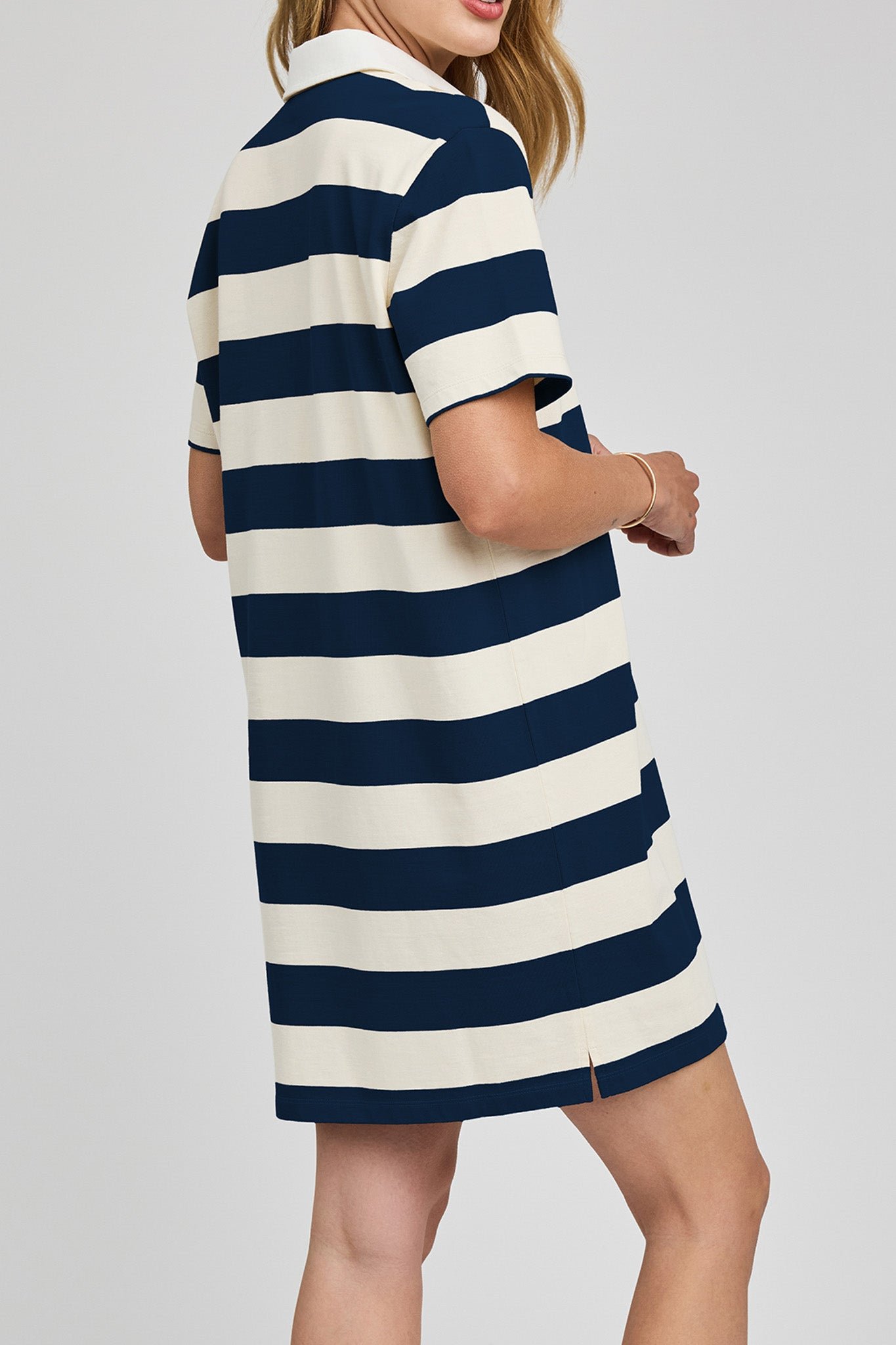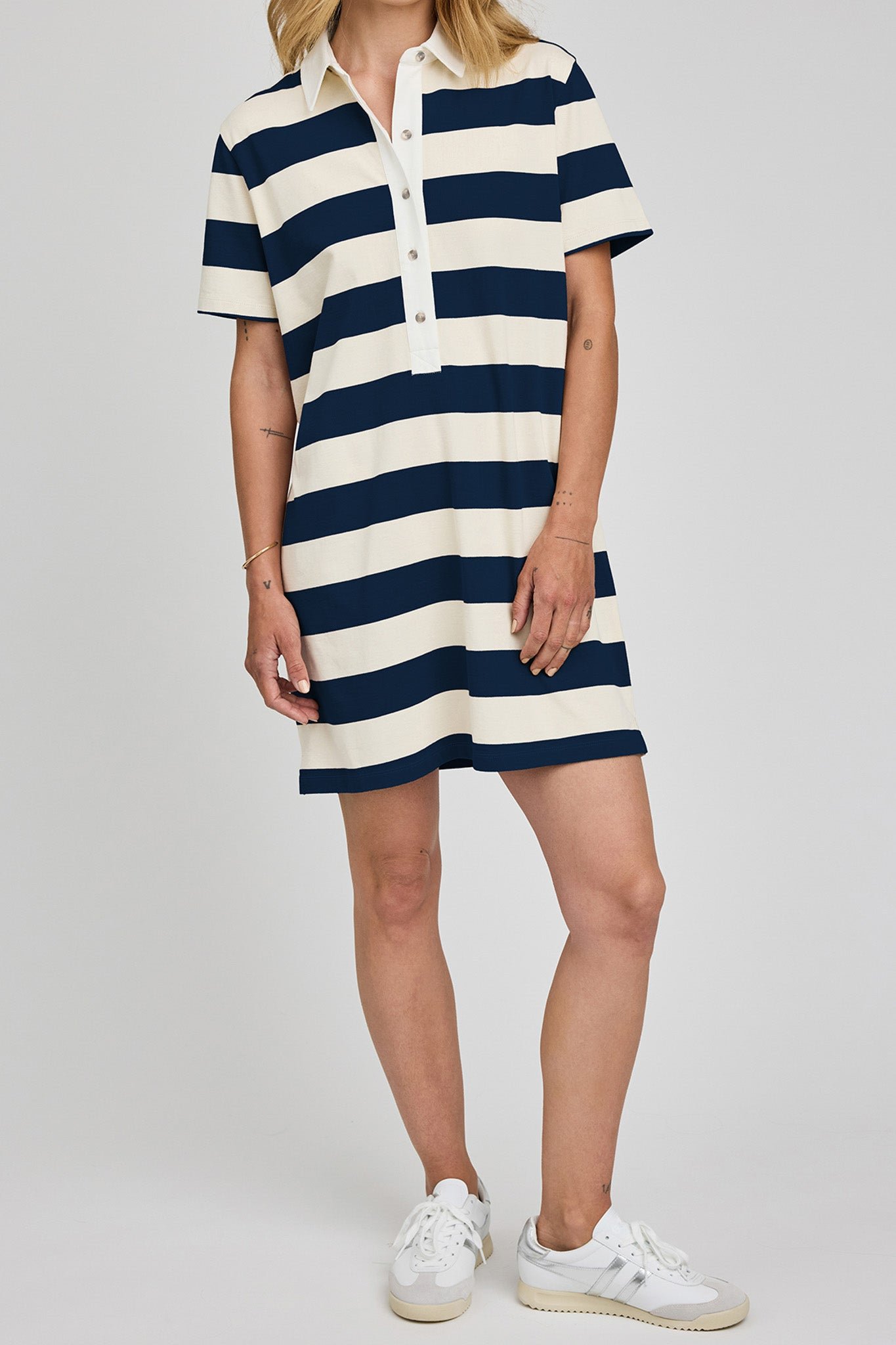 comfortable cotton jersey mini dress in navy blue and white rugby stripes. sporty dress has a relaxed fit and features a?contrast collar. half placket button closure. and side slits. dress can be paired with sneakers or sandals for an elevated casual look this spring and summer.