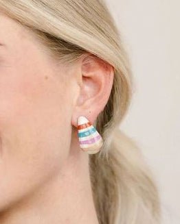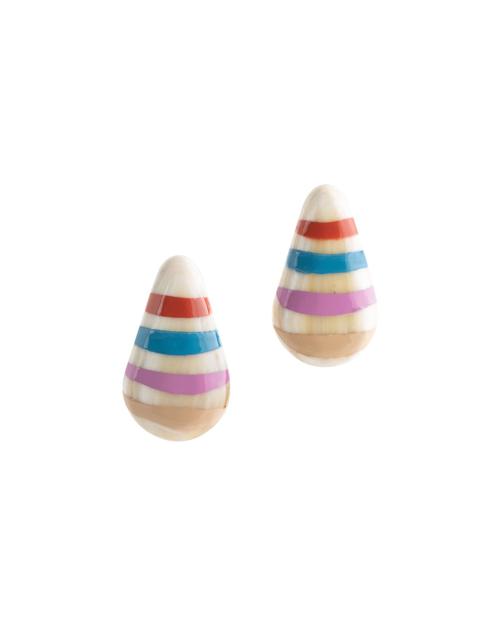 these colorful dew drop shaped earrings feature vibrant. stacked bands in red. blue. purple. and beige. fun and lively earrings will add playful pops of color to any ensemble.?