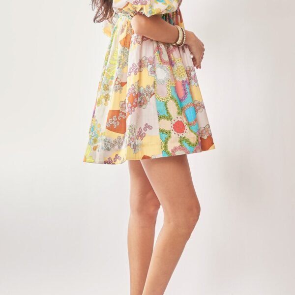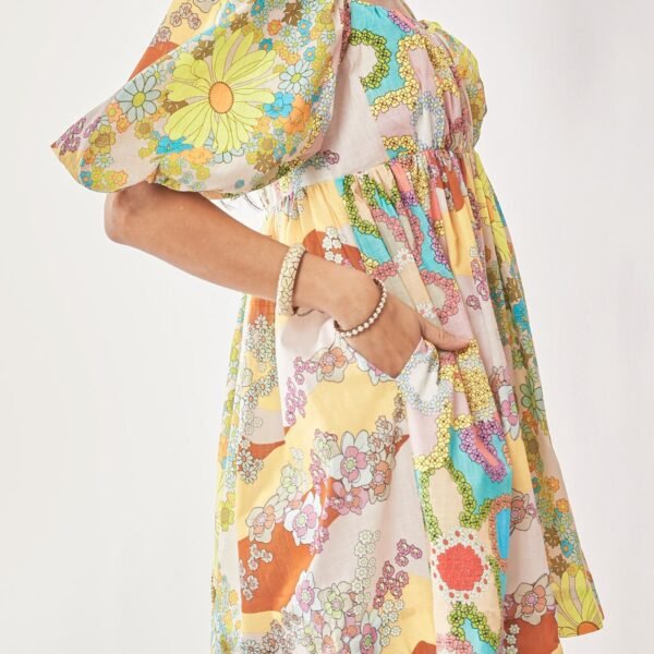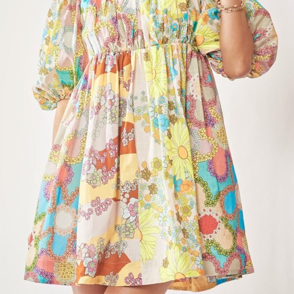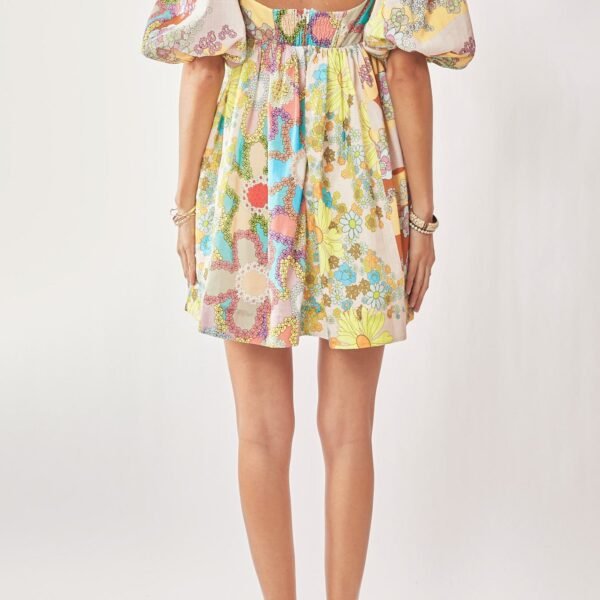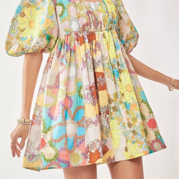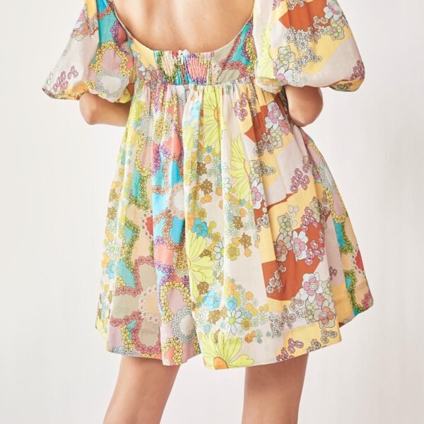 babydoll dress in a 70s inspired floral print. lined dress is lightweight and made from a nice feeling material. it features a square neckline. gathered bust. three-quarter length balloon sleeves. a low back with a bit of smocking and a hidden zipper. side pockets. and a swingy mini skirt. easy to wear dress has a flattering and fun shape. and it is available in inclusive sizing.?