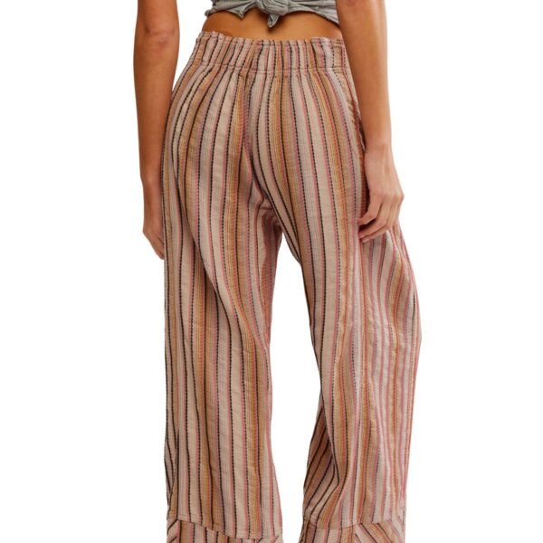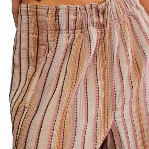 free people breezy and effortless striped pull on pants. mid-rise pants are generously sized and have a?relaxed wide-leg silhouette. pants feature a soft yarn-dyed striped fabrication. stretchy elastic waistband. side pockets. and a contrasting striped wide bottom hem. easy to wear pants can be paired with a baby tee or thrown on over swimwear.?