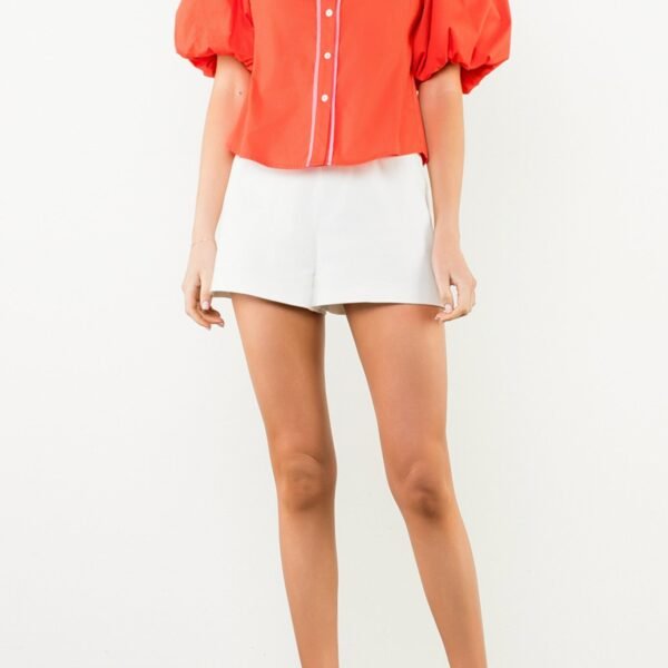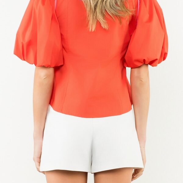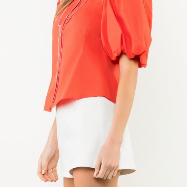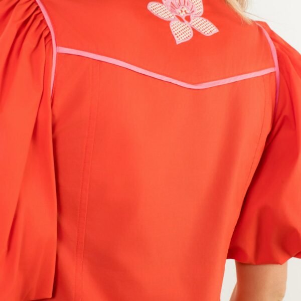 western-inspired warm red top with special elevated details. top features a petite collar. button front with pink piping. beautifully embroidered floral details on yoke and back. short balloon sleeves. and a relaxed fit. top is generously sized and on trend for the fall.?