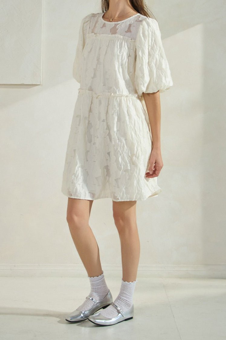 sweet mini dress in a slightly textured jacquard material in ivory. dress has a babydoll shape and features a crew neckline. keyhole closure on back. sheer yoke. short bubble sleeves. ruffle details at bust and waist. and a loose. relaxed fit. dress is a perfect option for graduations. bridal events. or baby showers. dress is available in inclusive sizing.?