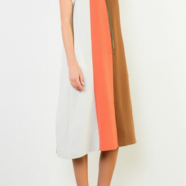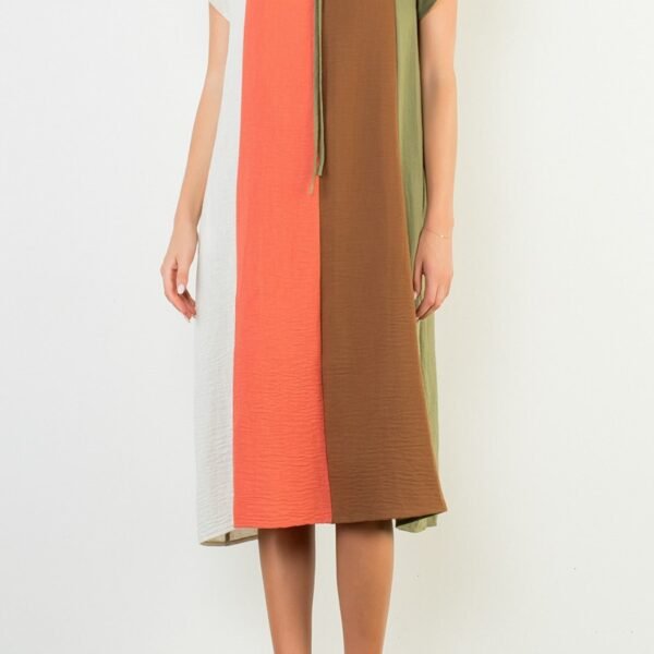pretty midi dress with a special paneled design in white. deep coral. chocolate brown. and olive green. dress features a ruffled v neckline with tie detail. roomy short sleeves. and a flowy silhouette. dress can be layered and worn into the fall and then styled with sandals to wear in the spring and summer.?