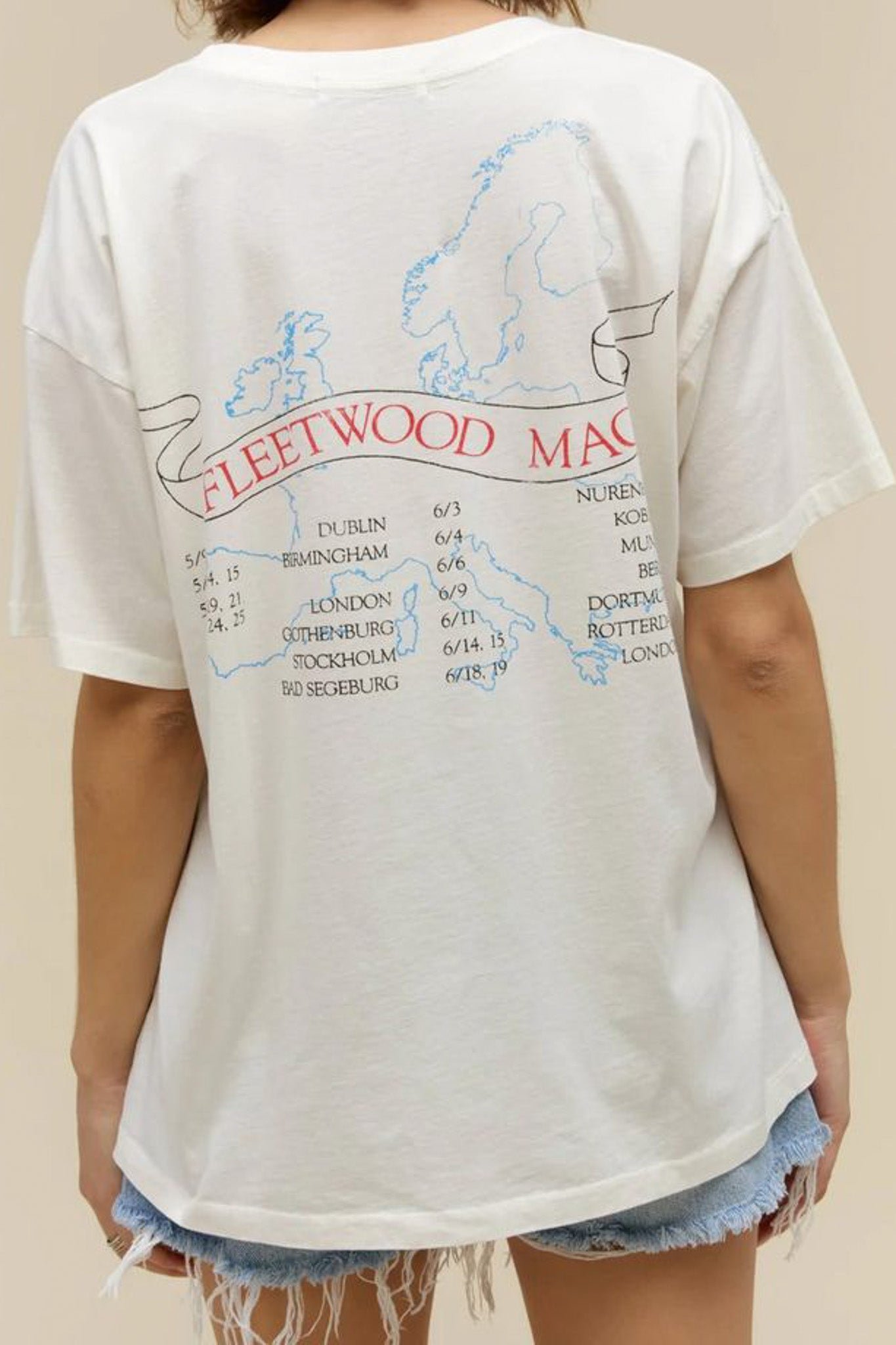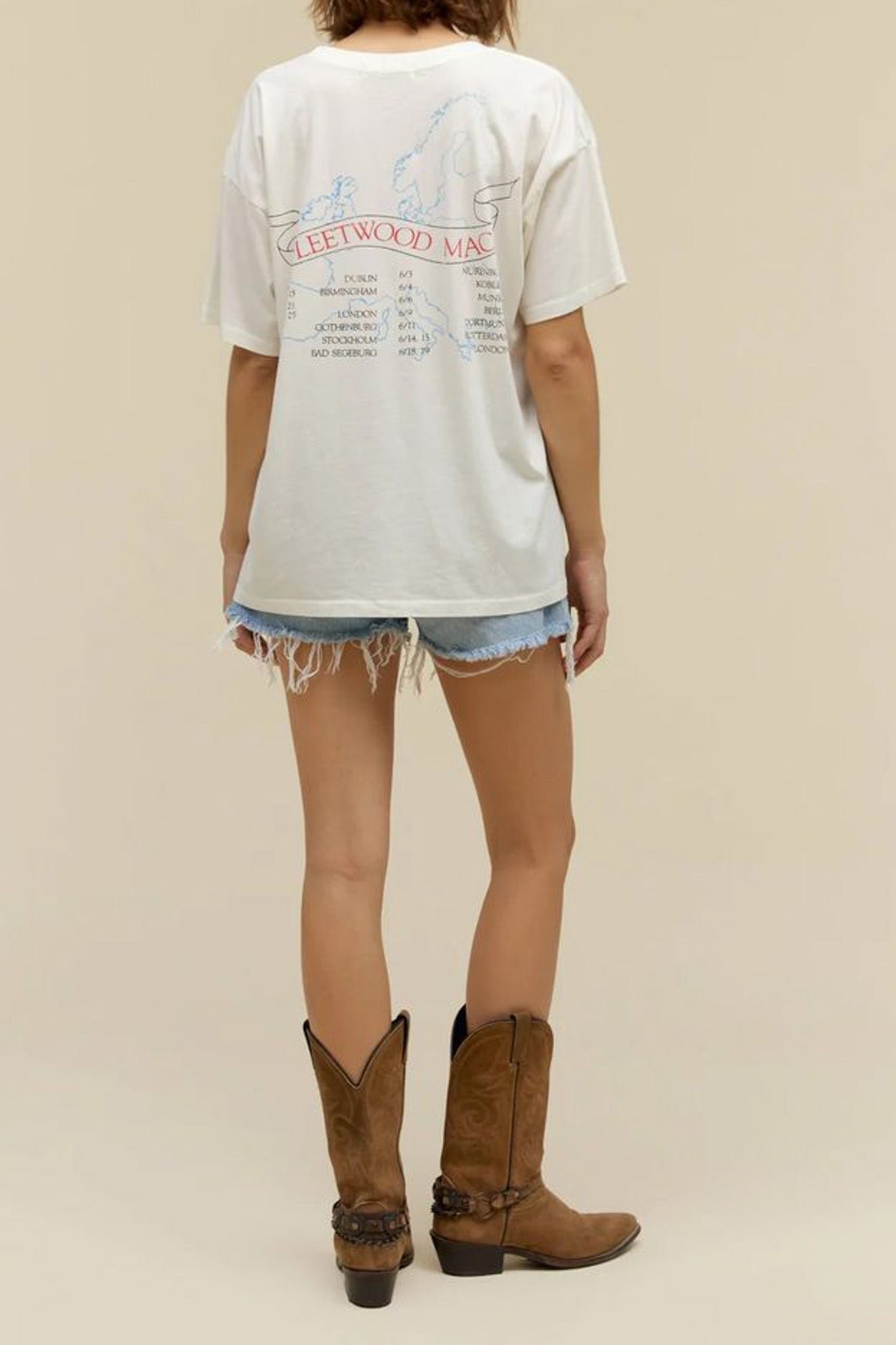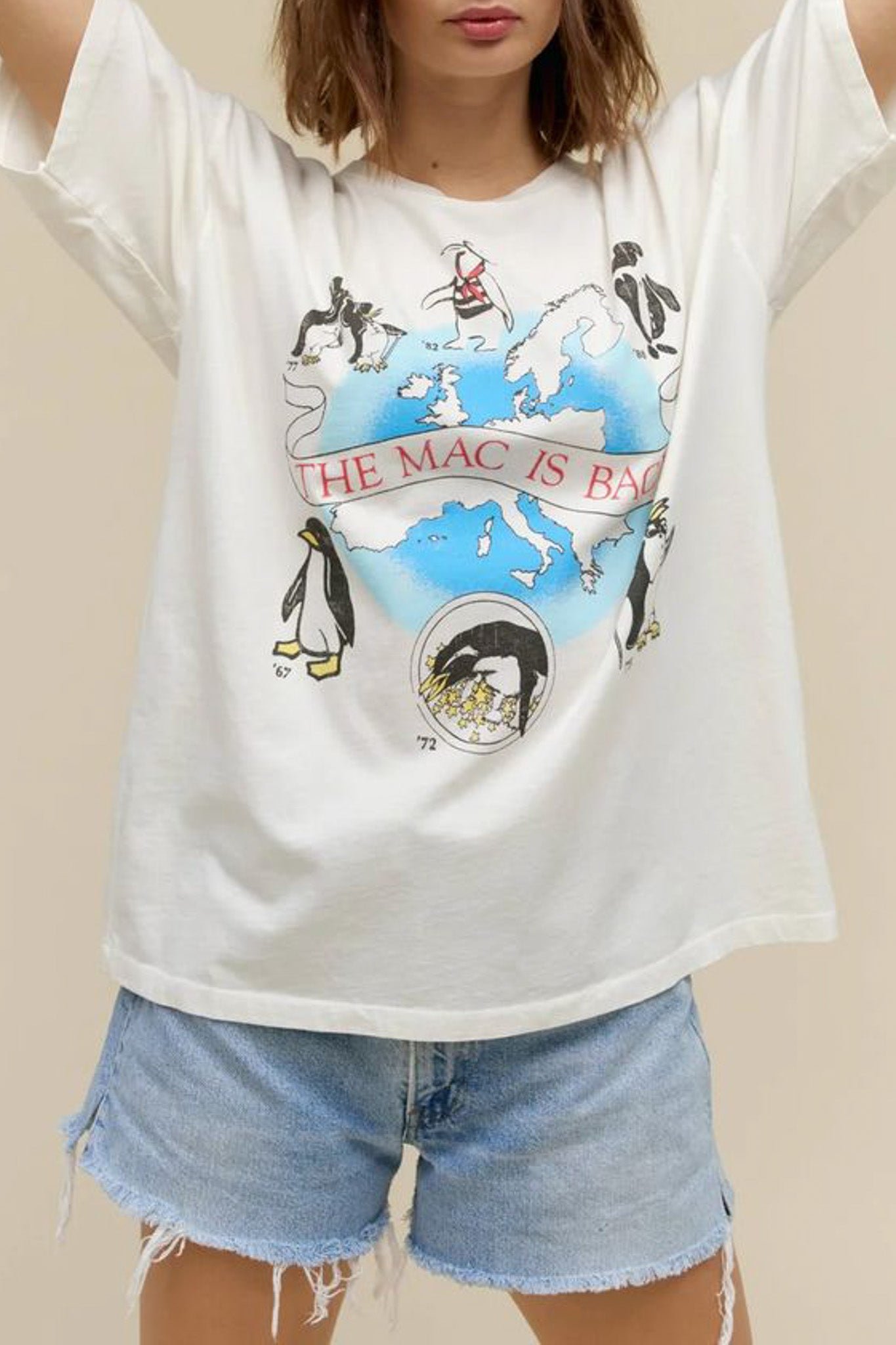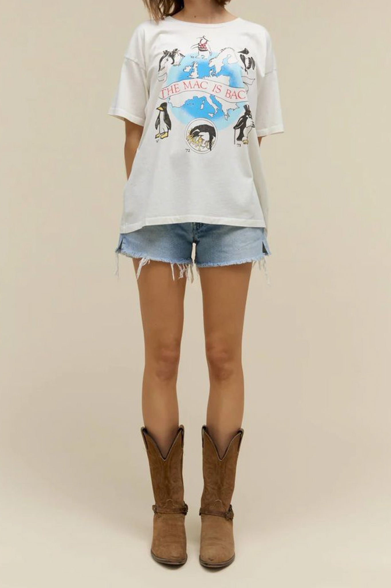 daydreamer merch tee celebrating rock legends fleetwood mac! fresh feeling white tee features cute penguin graphics commemorating influential years for the band. back of tee is stamped with dates and locations of hit shows from around the world. oversized tee is cute and fun for the summer! merch tee is a mix between daydreamer’s one size t-shirt and weekender tee. made to fit you like a perfect vintage find.?