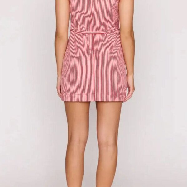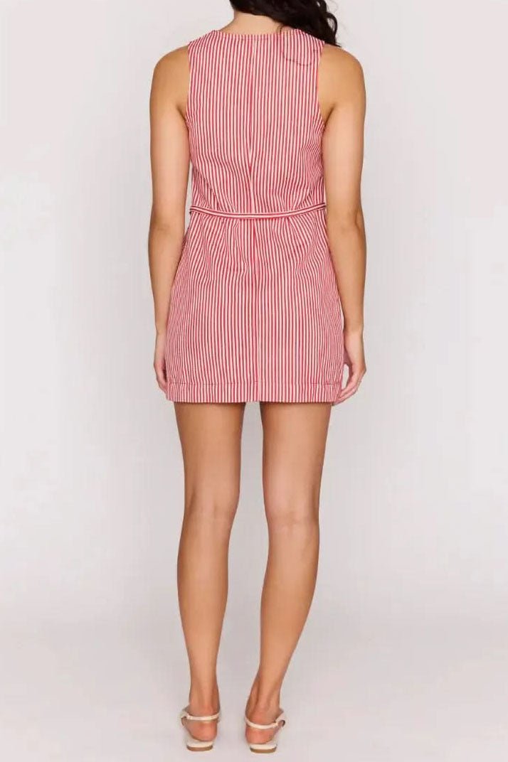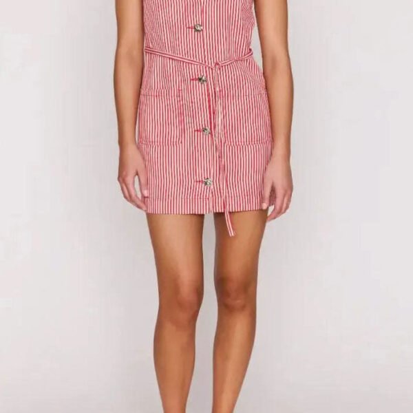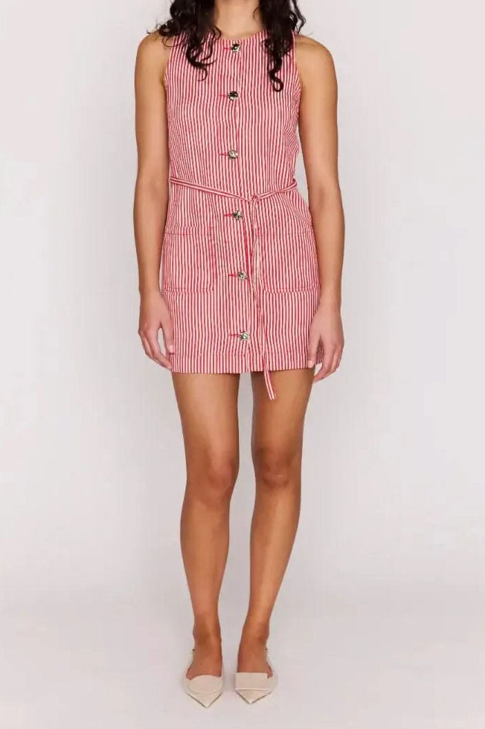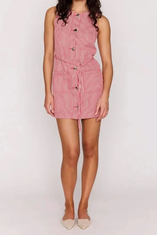 adorable and great-fitting shift dress in summery red and white stripes. dress features a high crew neckline. an elevated silver button front. adjustable belt tie. and two front patch pockets. versatile dress can be dressed up with heels or styled more casually with sneakers or sandals.?