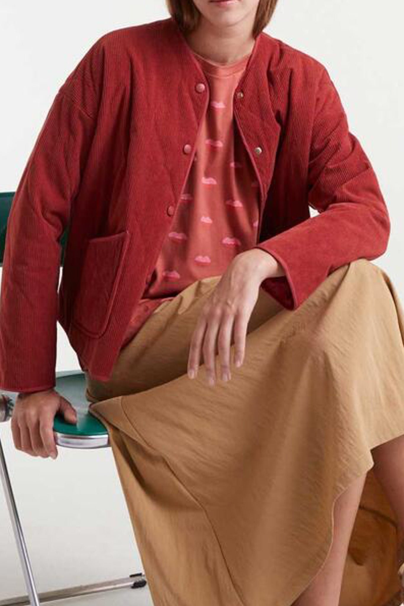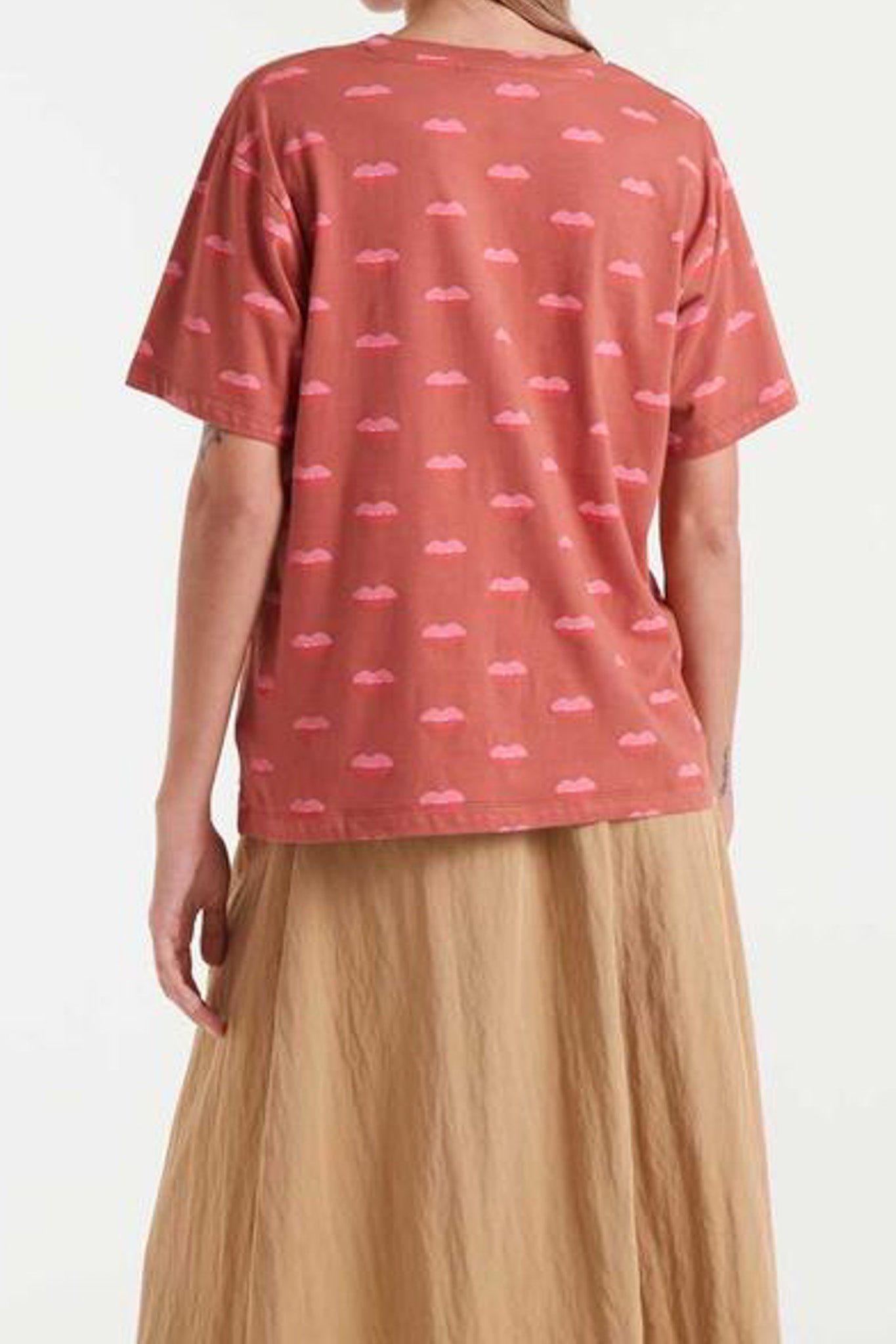 earthy red tee with a unique two tone pink heart/lips pattern. novelty tee features a classic crew neckline. dropped shoulders. short sleeves. and a slightly relaxed fit. tee can be styled solo with jeans or worn under your favorite cardigan or overalls. tee runs true to size.?