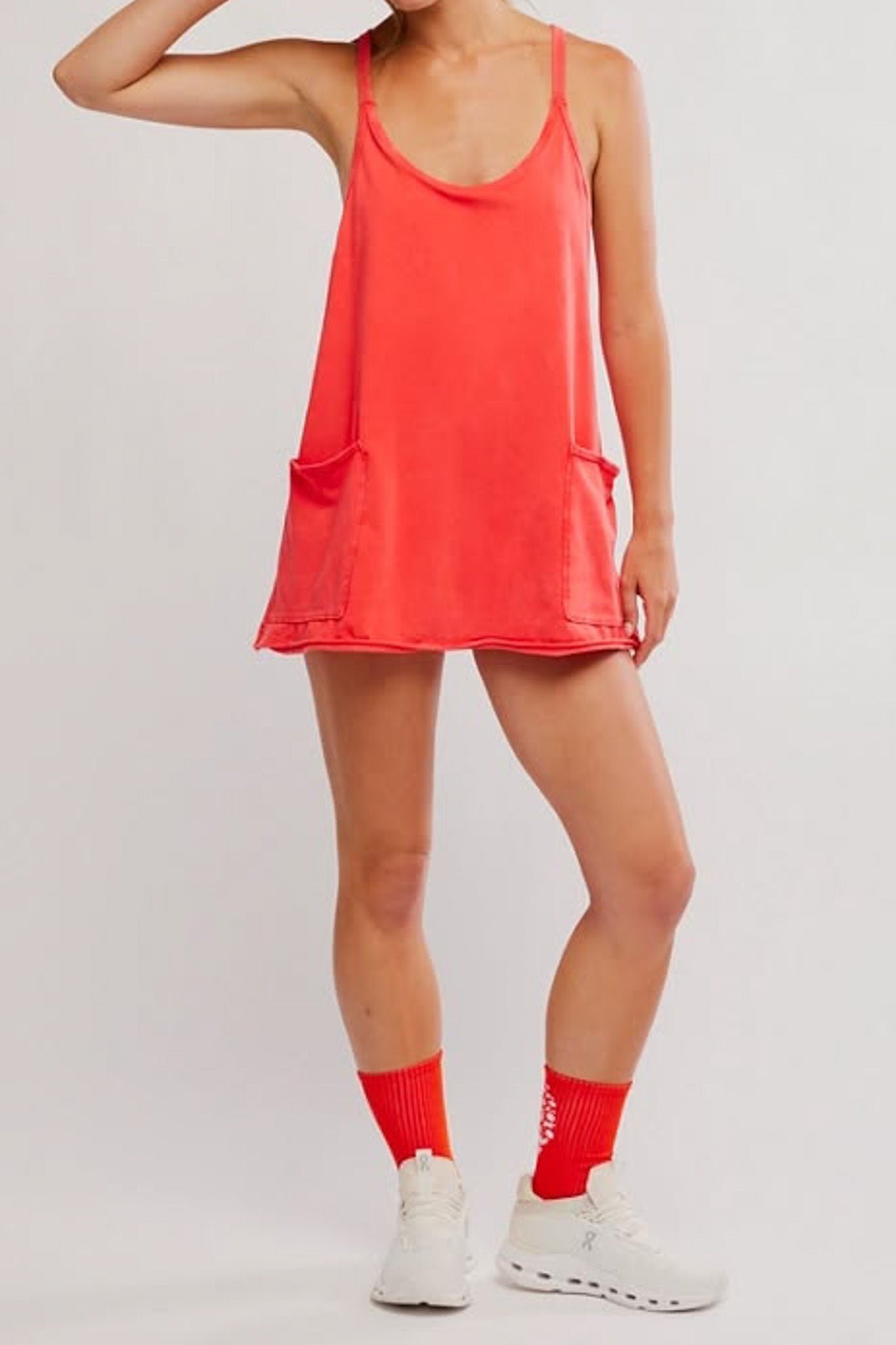 free people soft mini dress in springy coral. with a shapeless silhouette. this lightweight dress features?a scoop-neckline. thin shoulder straps. racerback detail with zippered pocket. and oversized patch pockets. interior of dress is lined with shorts at the bottom. easy to wear dress is generously sized and perfect for warmer weather.?
