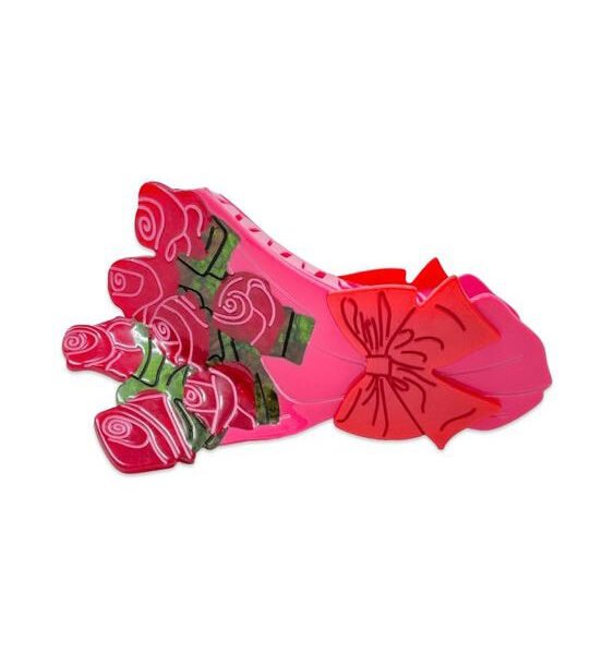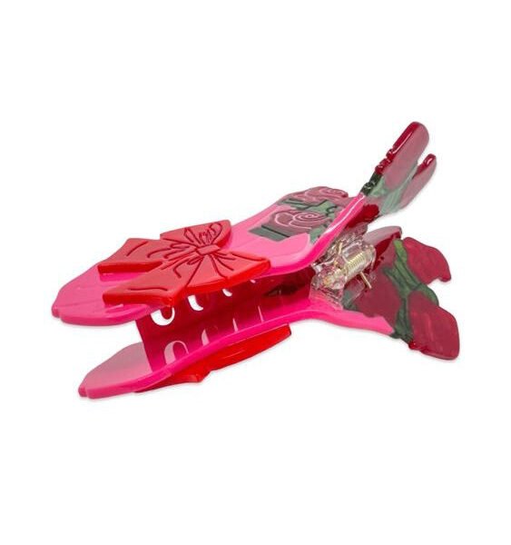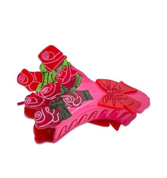 this hair claw is a candy colored love note for your hair. inspired by a bouquet of gummy roses. bright floral clip is crafted from plant-based cellulose acetate and hand-painted with sweet rose details. each claw is unique. perfect for romantic looks. spring outfits. or anyone who loves a fun statement accessory.