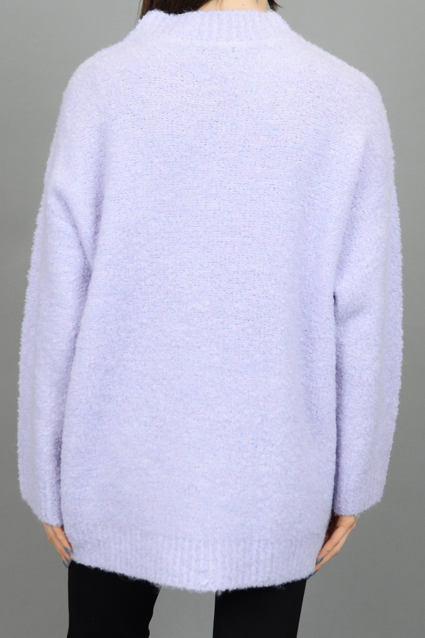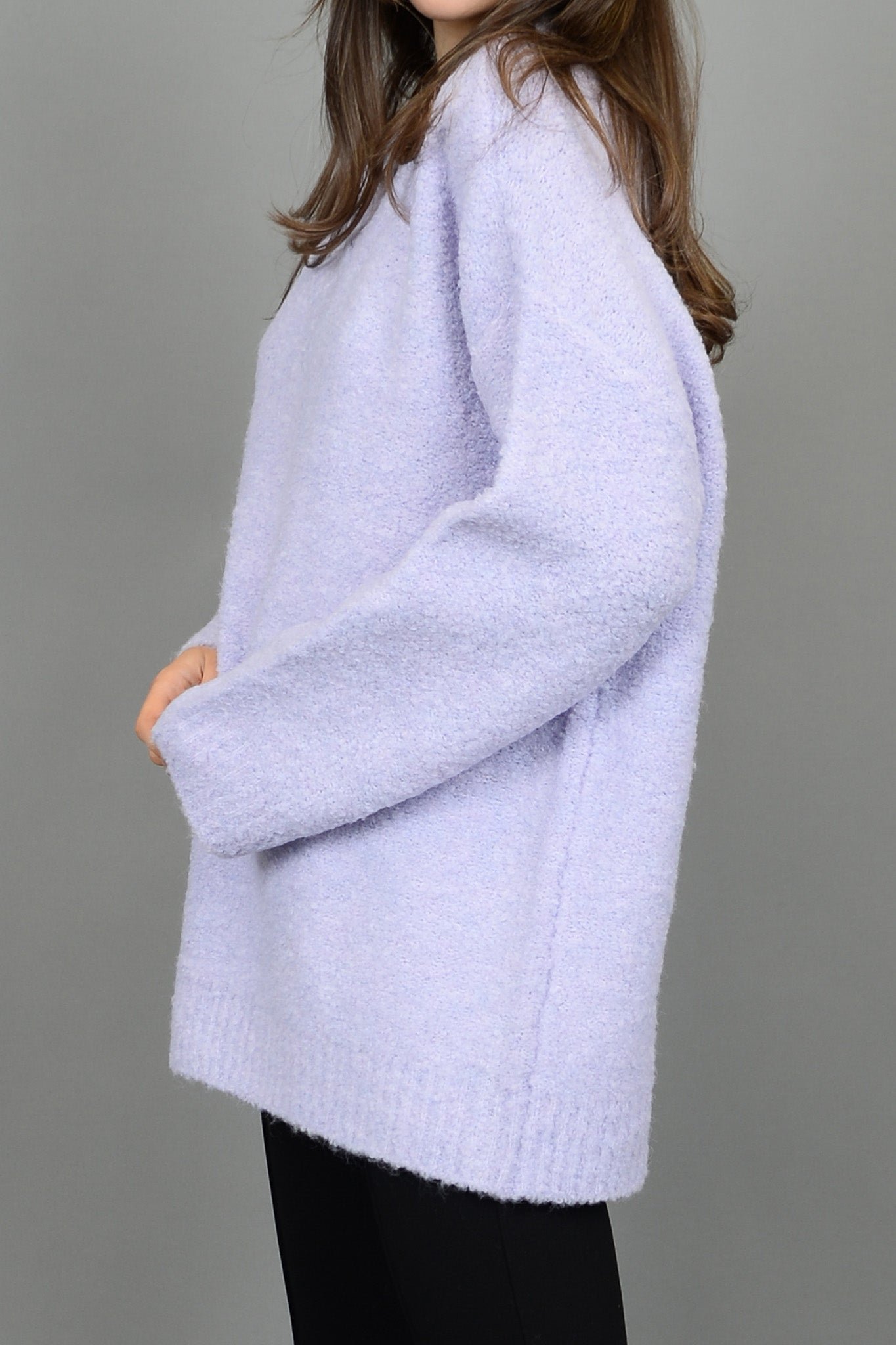oversized fuzzy sweater in pretty pale lilac. soft and comfortable sweater features a v neckline. dropped shoulders. roomy long sleeves. and an extra long fit. sweater has an easy fit that looks great with leggings or your favorite straight or wide leg jeans.?