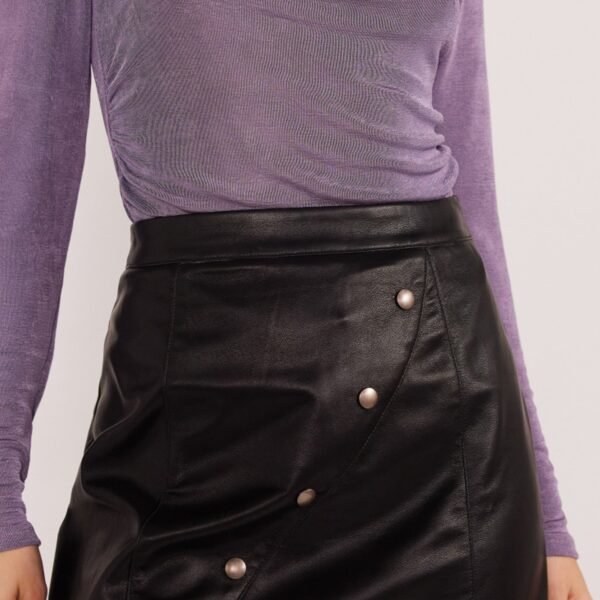 cute mini skirt made from black faux leather. skirt has a high-rise fit. studded and seamed details on front. exposed zipper on back. and a slightly longer mini length. versatile skirt can be dressed up or down for a variety of looks.?