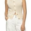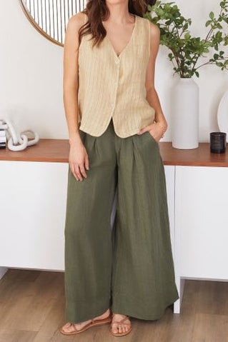 cool. elevated vest made from a deep tan linen with subtle grey pinstripes. generously sized vest features a button front. v neckline. and a relaxed fit. easy breezy vest can be worn on its own or layered for a cute casual look.?