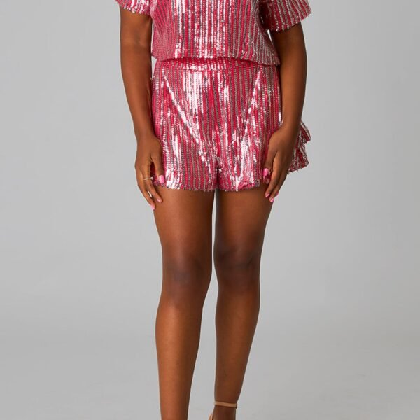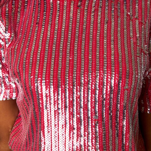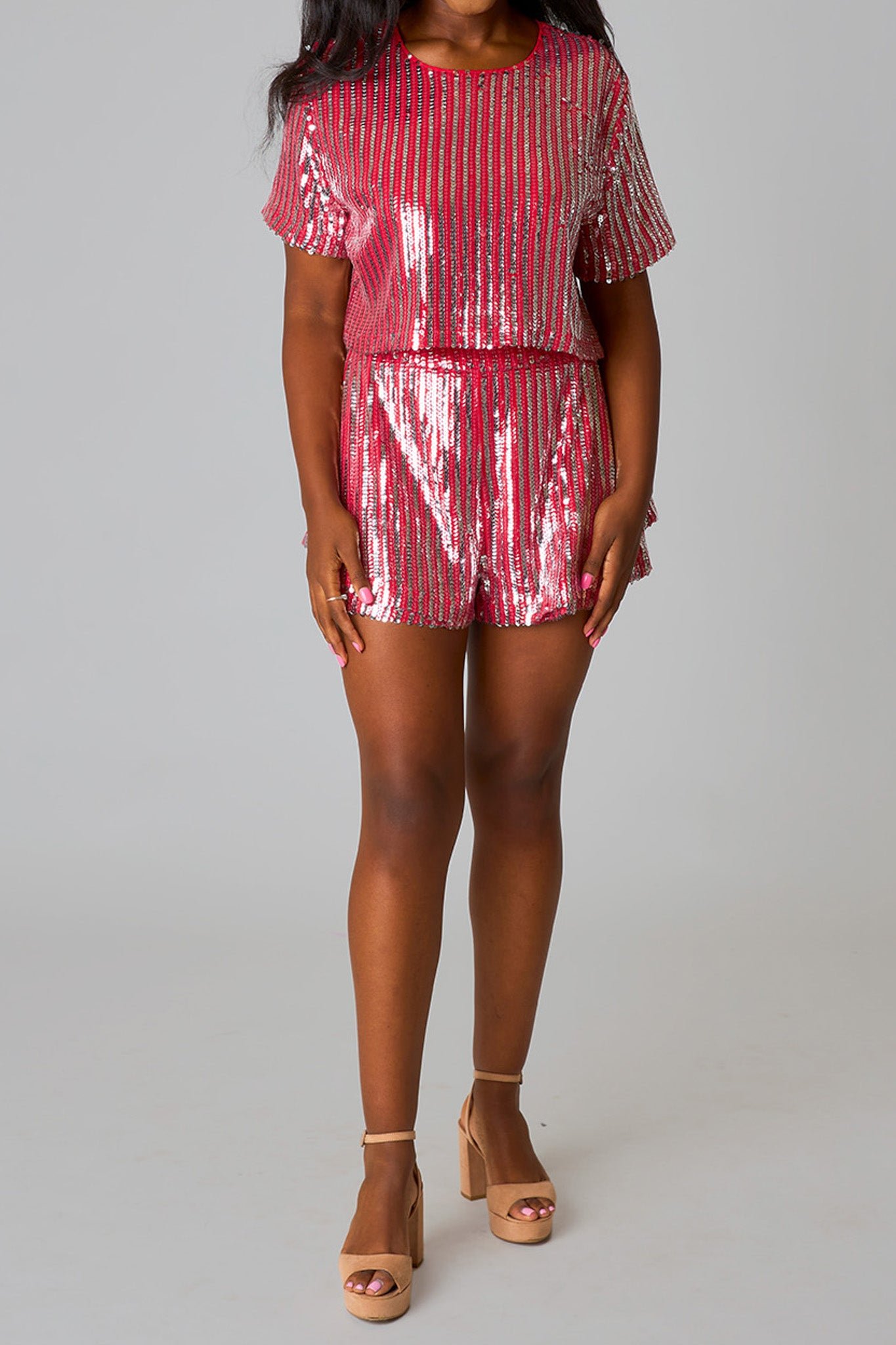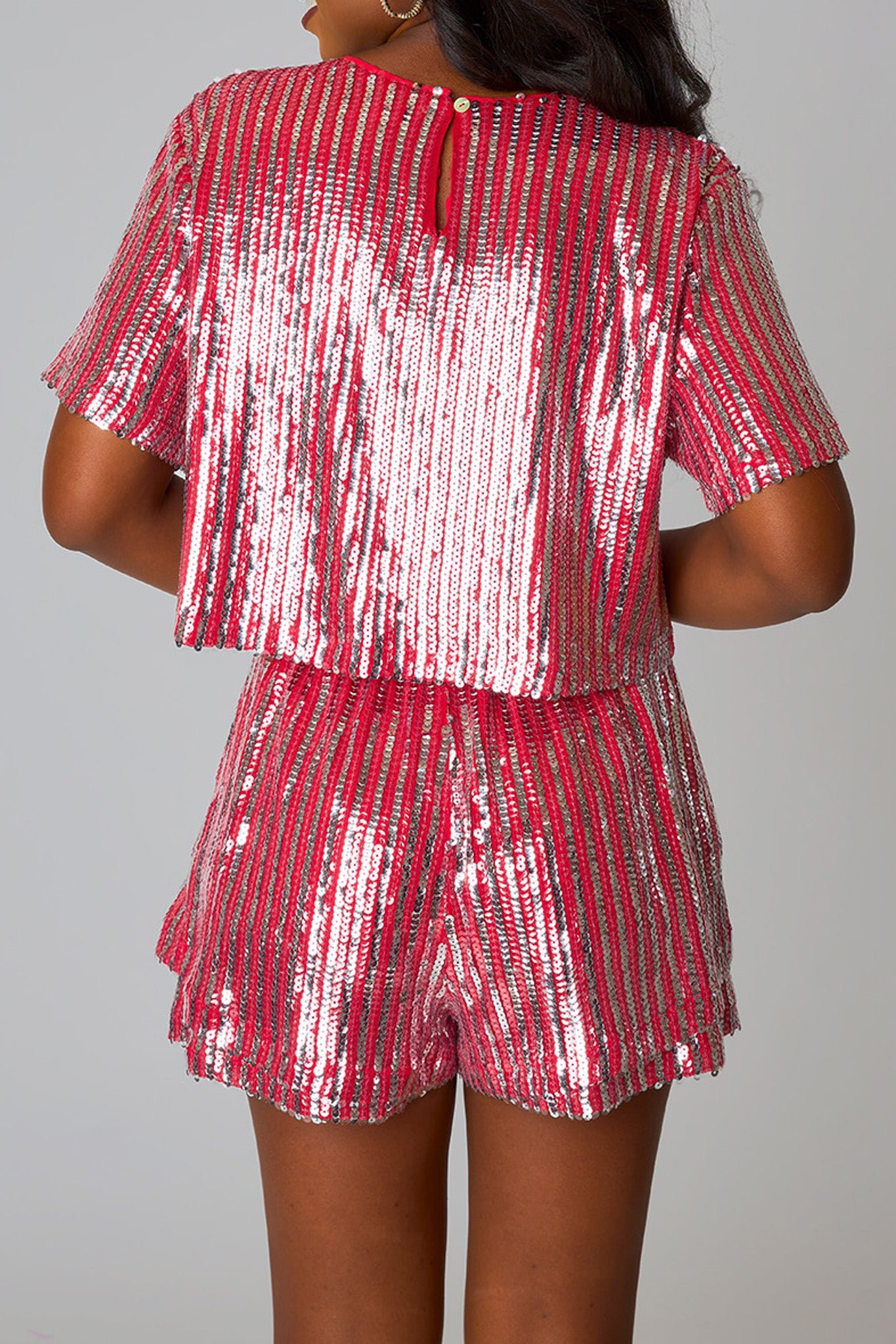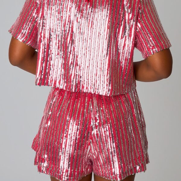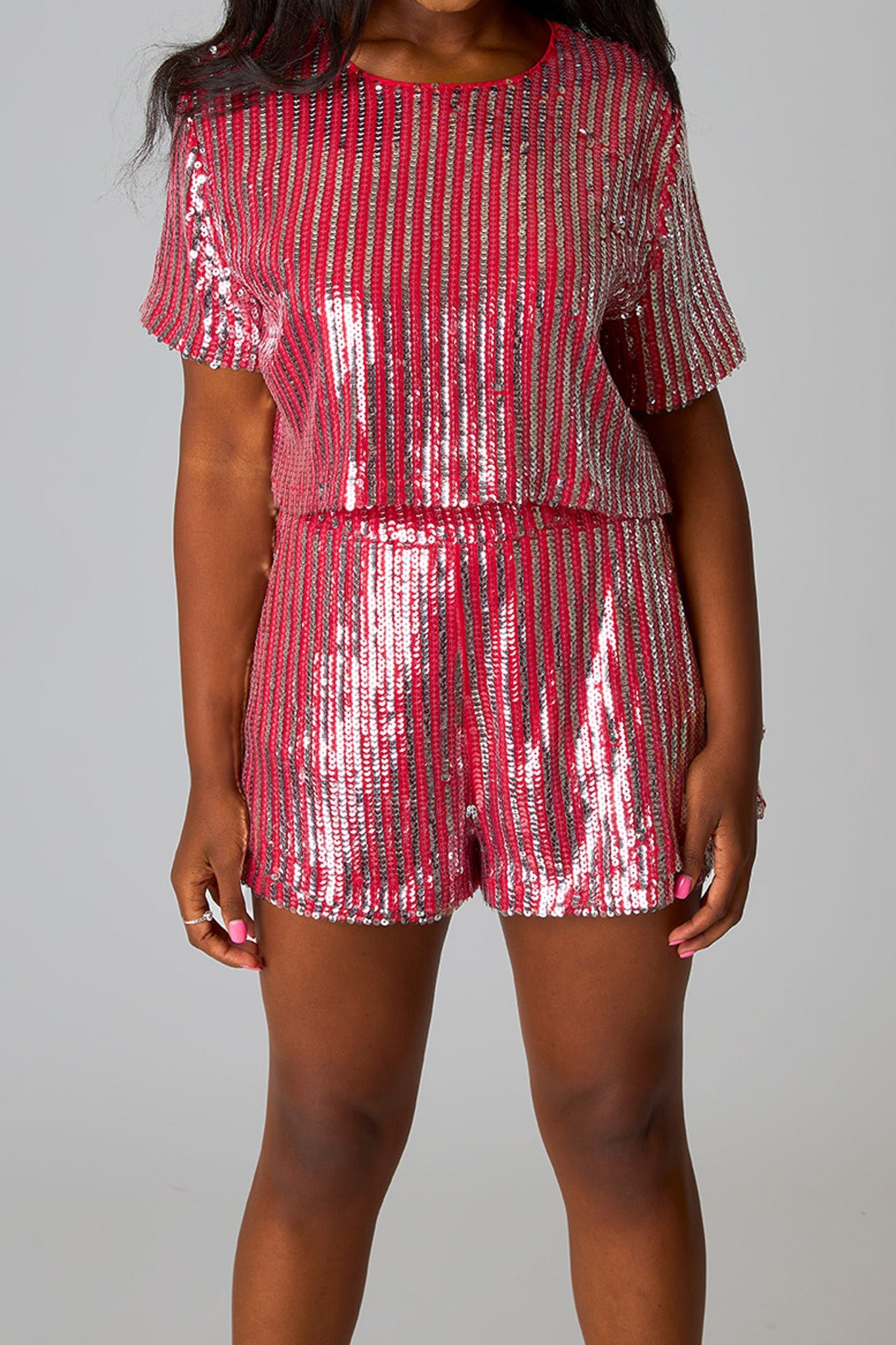 cute and fun?shorts set in red and silver sequined stripe pattern. top features a crew neckline with a keyhole back and slightly cropped length. while shorts feature a mid-rise fit with two layers of sequined fabric. giving shorts a flouncy look. make a statement by wearing the set together or separate the pieces to suit your own unique style.?