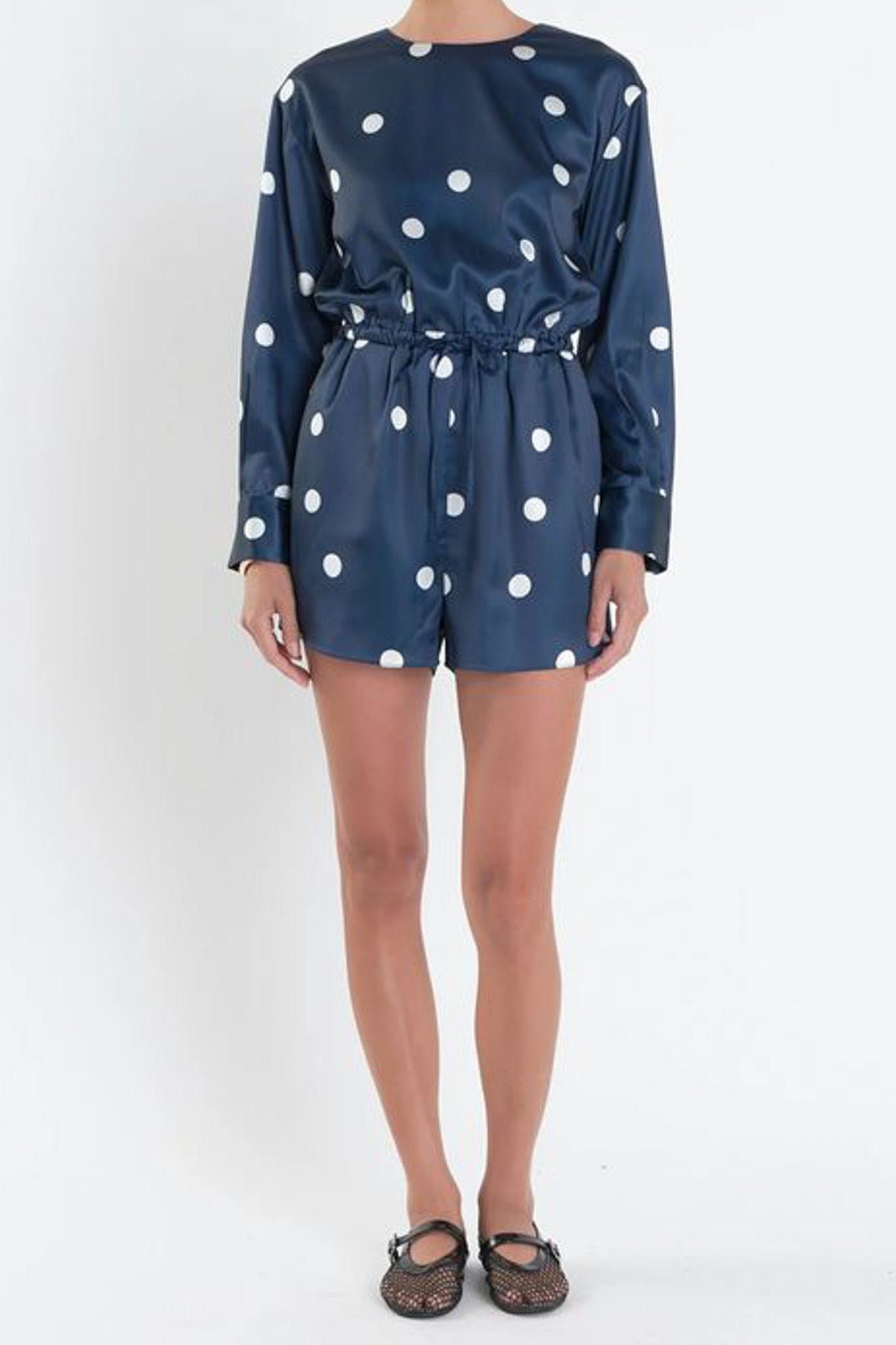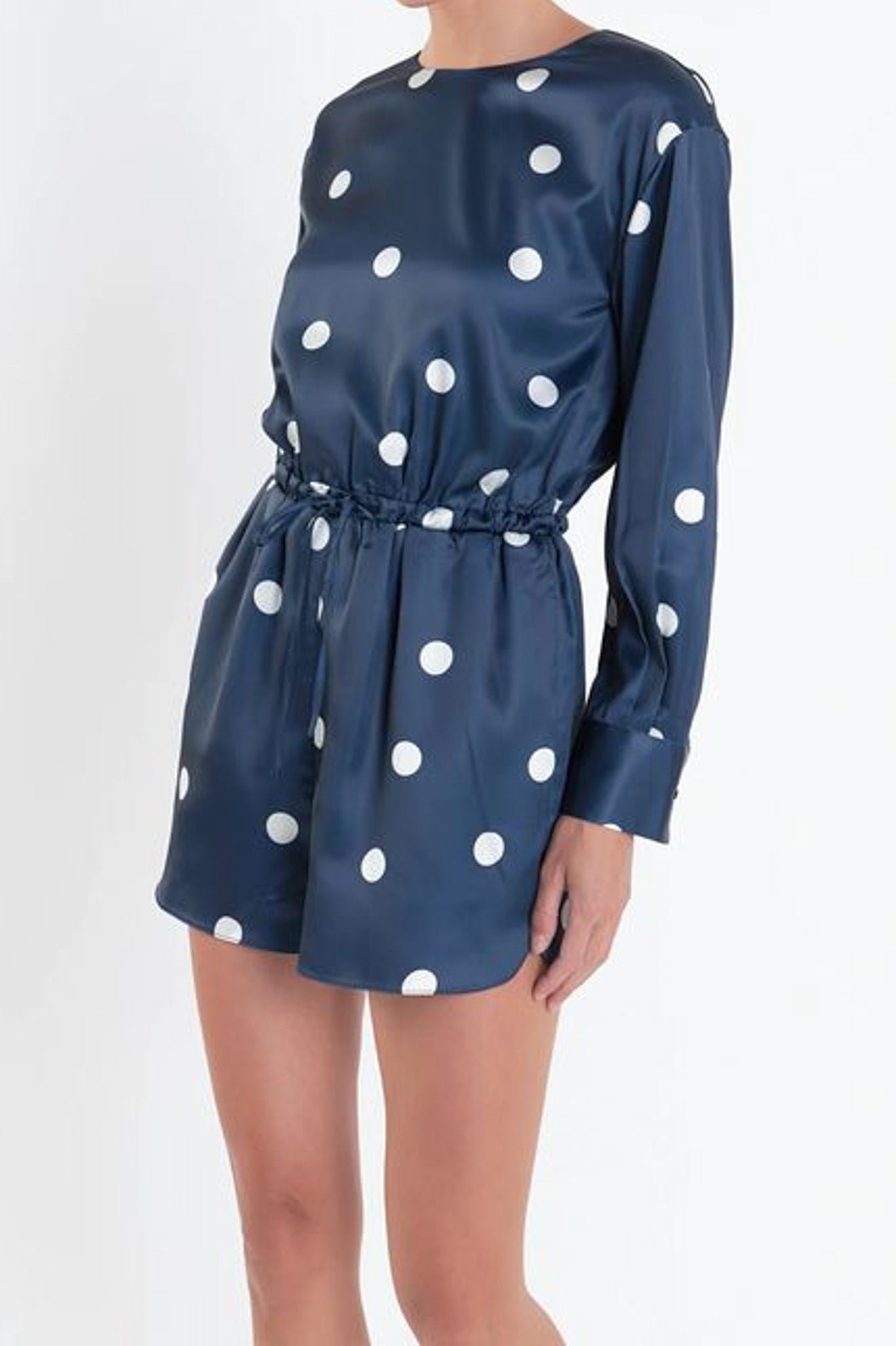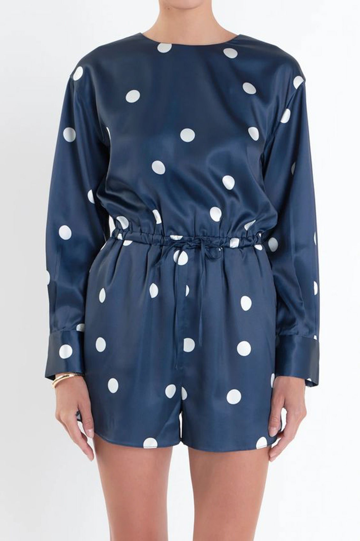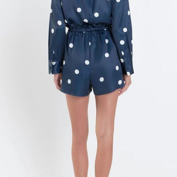 satiny romper in navy blue with sweet white polka dots. lined romper is made from a thicker silky material that has a nice look and feel. it features a crew neckline. roomy cuffed long sleeves. side pockets. and an elastic waistband with drawstring. allowing you to accentuate your waist. romper has a back interior button with a button loop closure. stylish and comfortable romper is cute and chic – perfect for a night out or fancy brunch.?