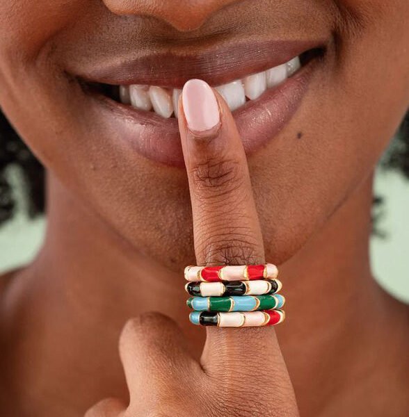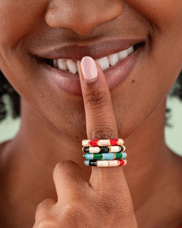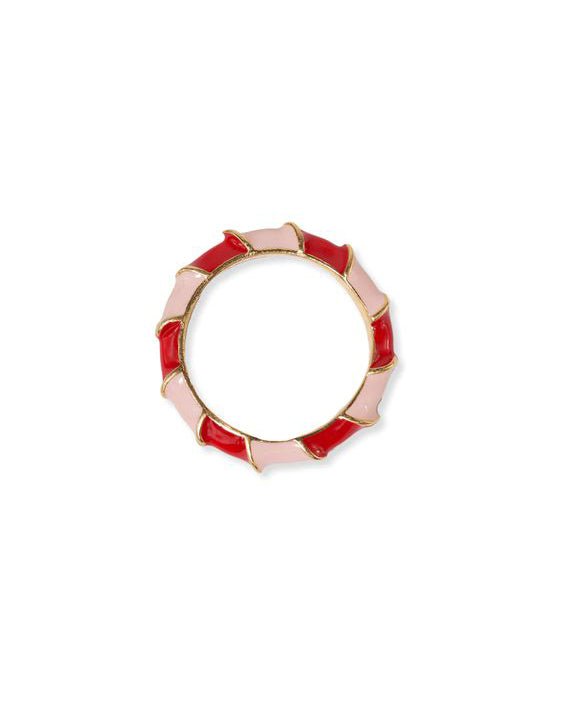 add a pop of color to your ensemble with this twisted color block enamel ring. brass cocktail ring features a twisting design with color-blocked stripes. creating a contemporary and eye-catching look. its vibrant tones make it a perfect accessory for adding a touch of playful elegance to your style. pair it with the pippa earrings for a coordinated and fashionable everyday look.?