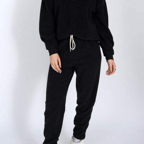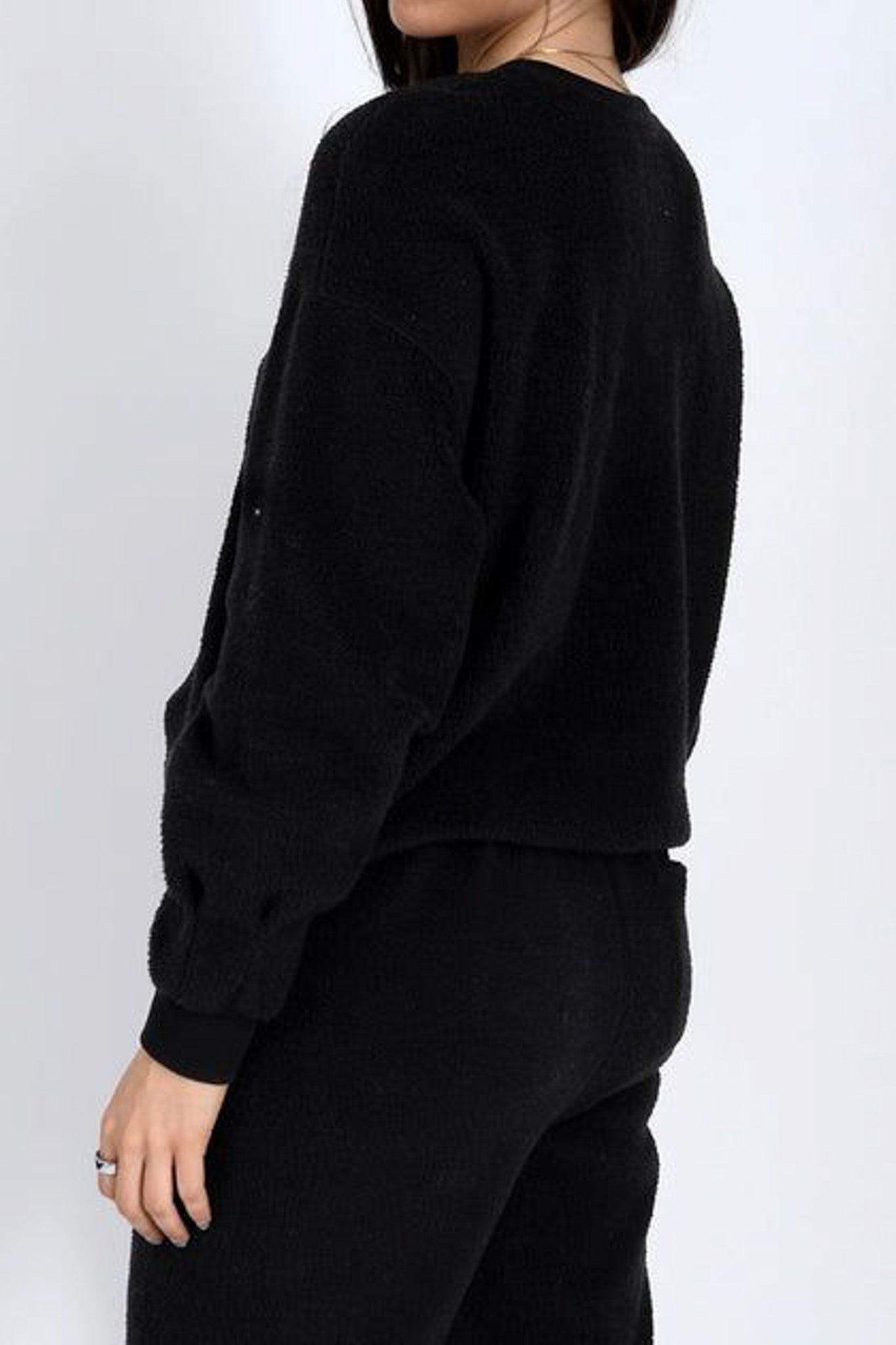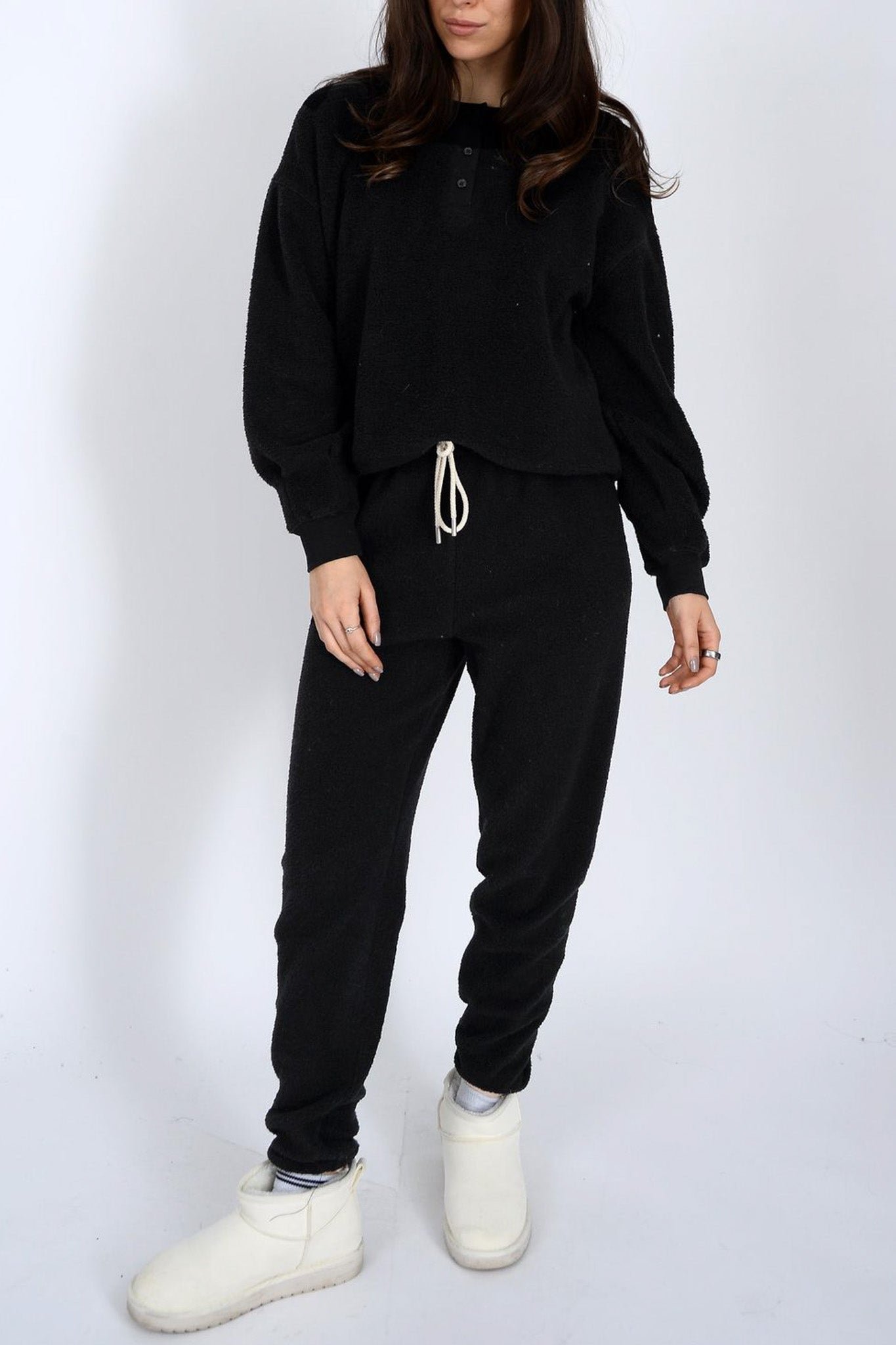 soft and cozy fleece henley in classic black. top features a crew neckline. half button front. dropped shoulders. roomy long sleeves. and a cropped. slightly boxy fit. style top casually with jeans or pair with the jayce joggers for the cute. coordinated look pictured last.?