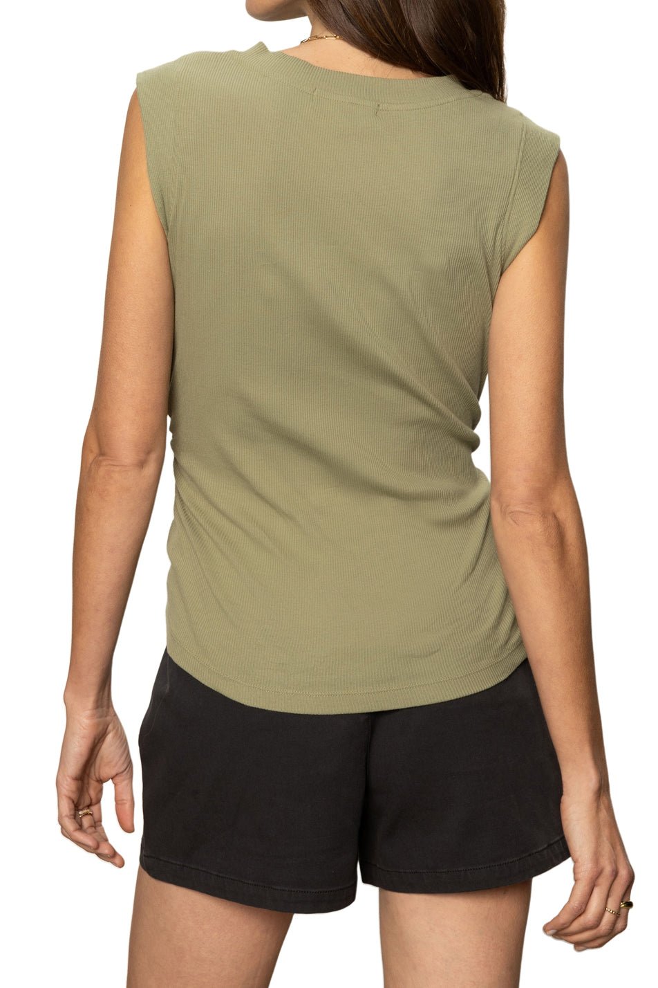 fitted ribbed tank in pretty sage green. soft and comfortable tank features a high crew neckline and ruched sides. great-fitting tank is a cute. easy to wear basic for summer.?
