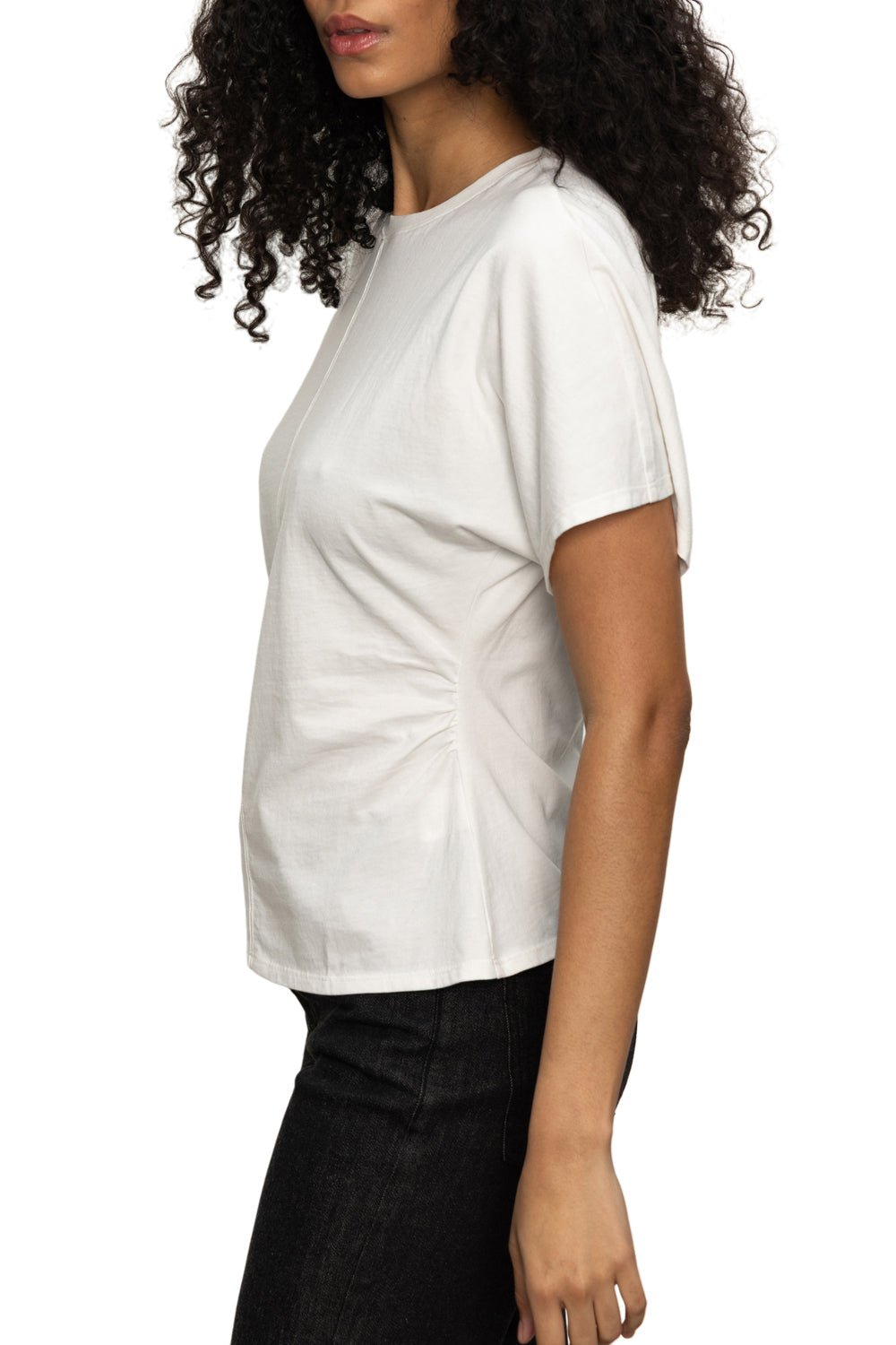 soft and comfortable elevated white tee. easy to wear tee features a crew neckline. dolman-style short sleeves. and special shirred details at the waist. versatile top makes a wonderful alternative to your basic white tee.?