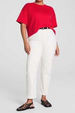 spanx red cropped tee is crafted from 100% premium cotton with a proprietary finish for a cool. smooth. and slightly silky feel. with a relaxed fit and hip-length design. this crewneck shirt will be your go-to. elevated essential.