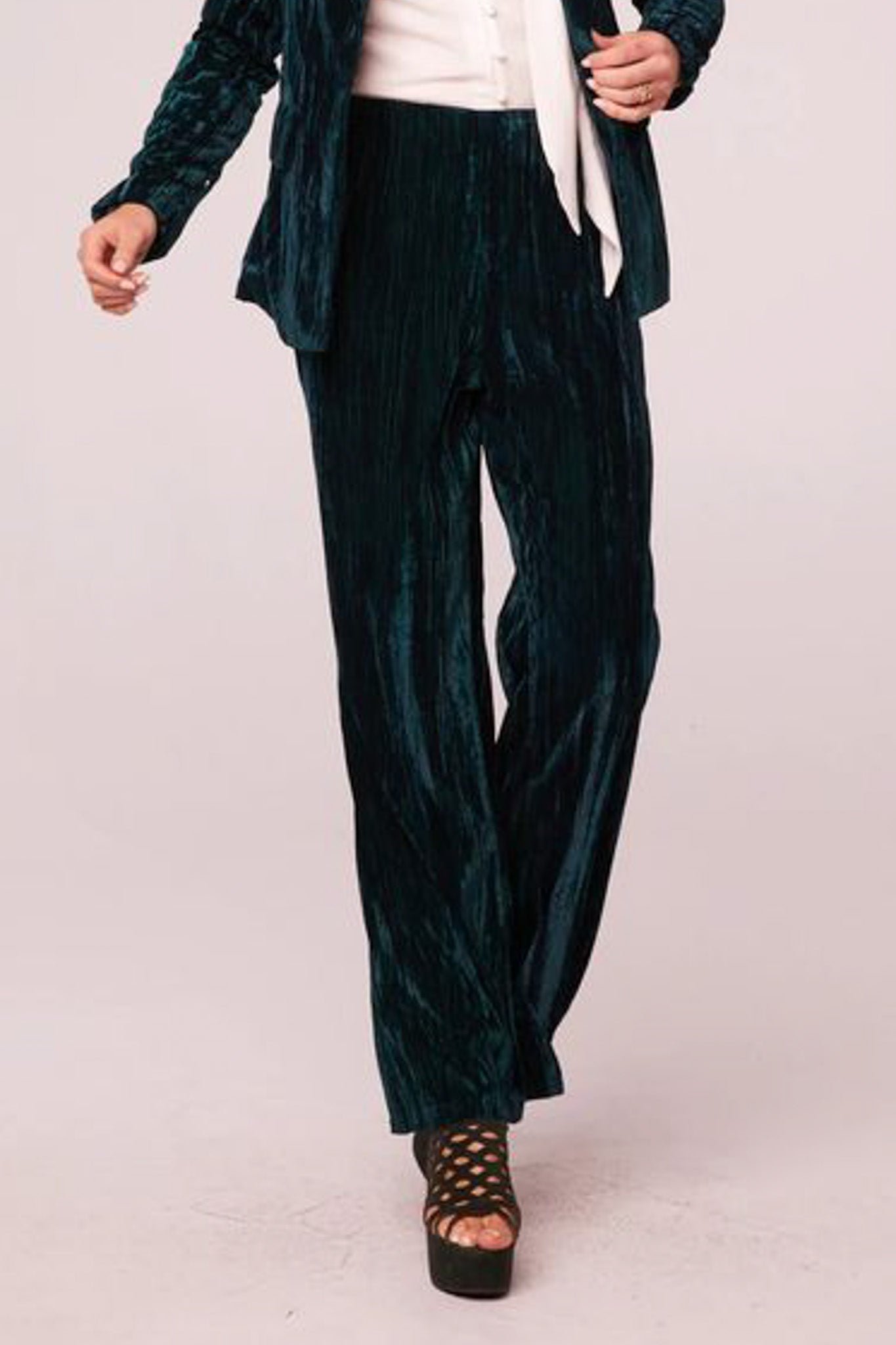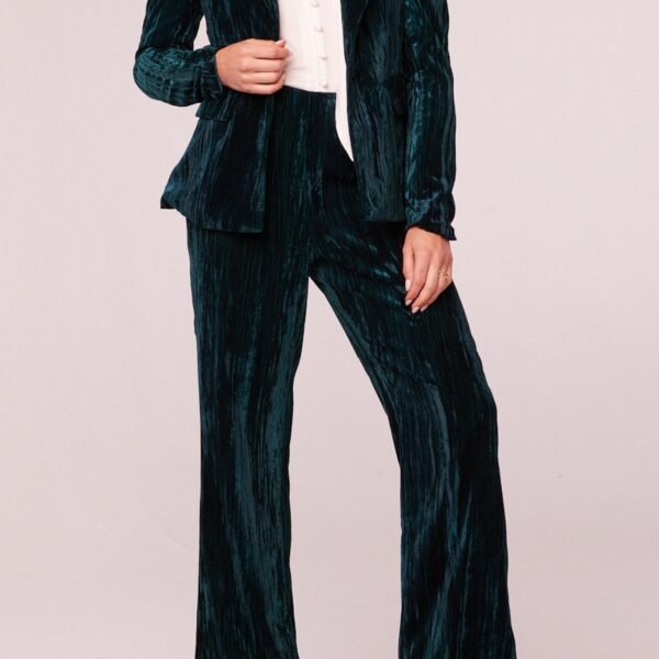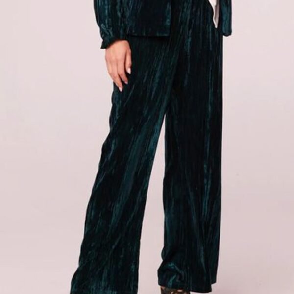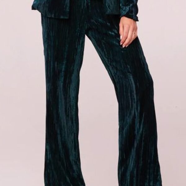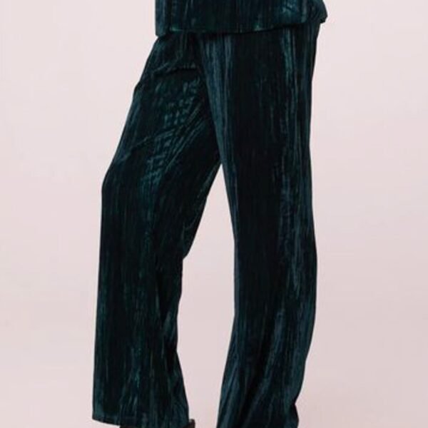 high-waisted pants in stunning deep pine green crushed velvet. pull-on pants feature a stretchy elastic waistband and retro-inspired wide leg fit. pants make a fun and different option for holiday wear. but can be worn more casually paired with a graphic tee.?