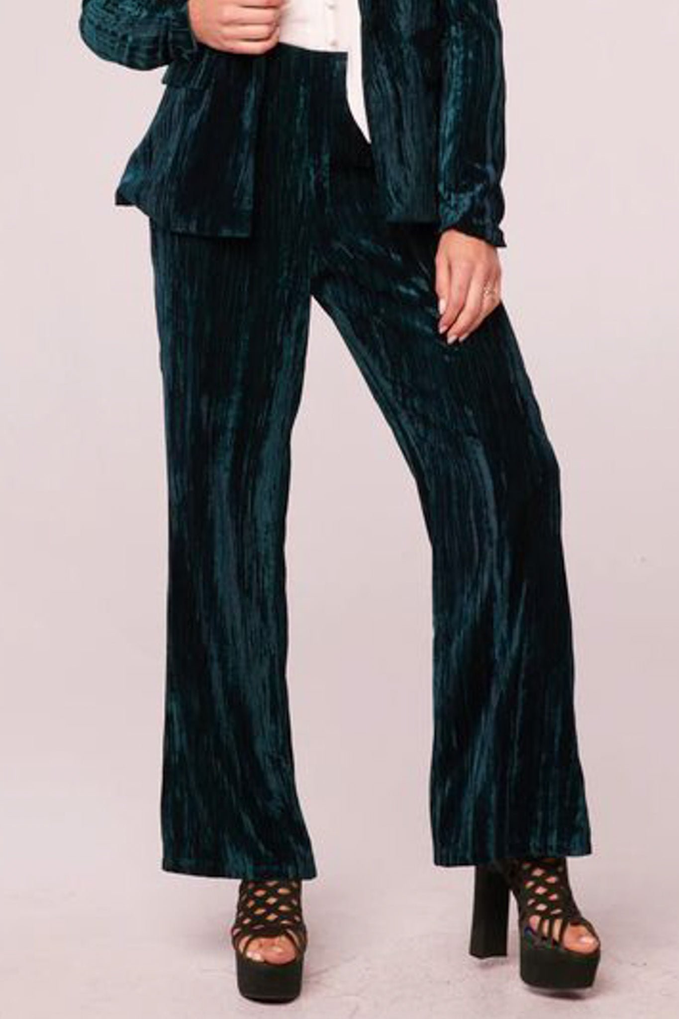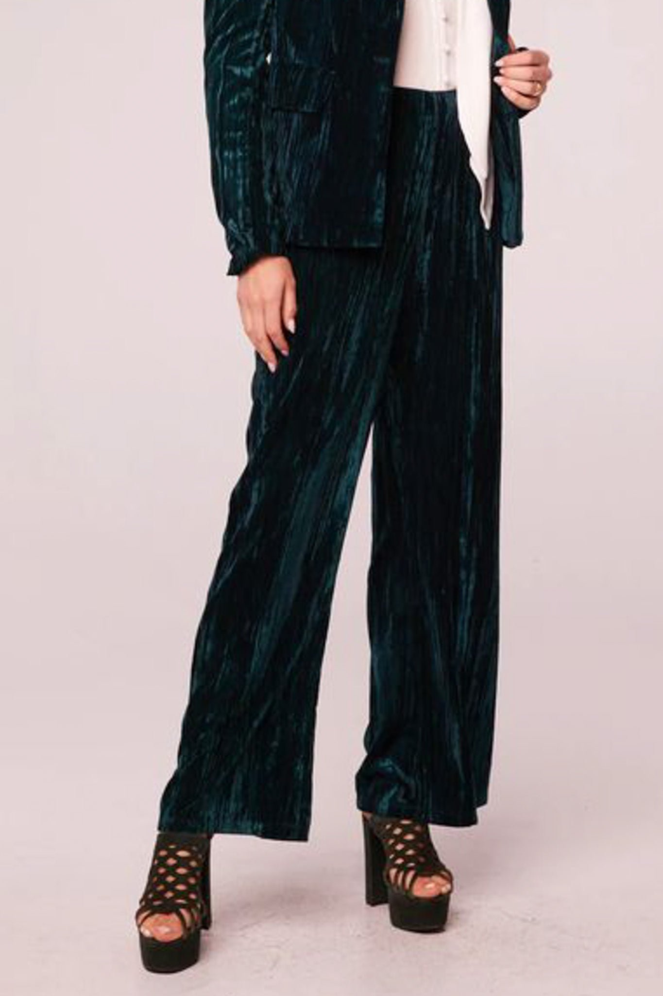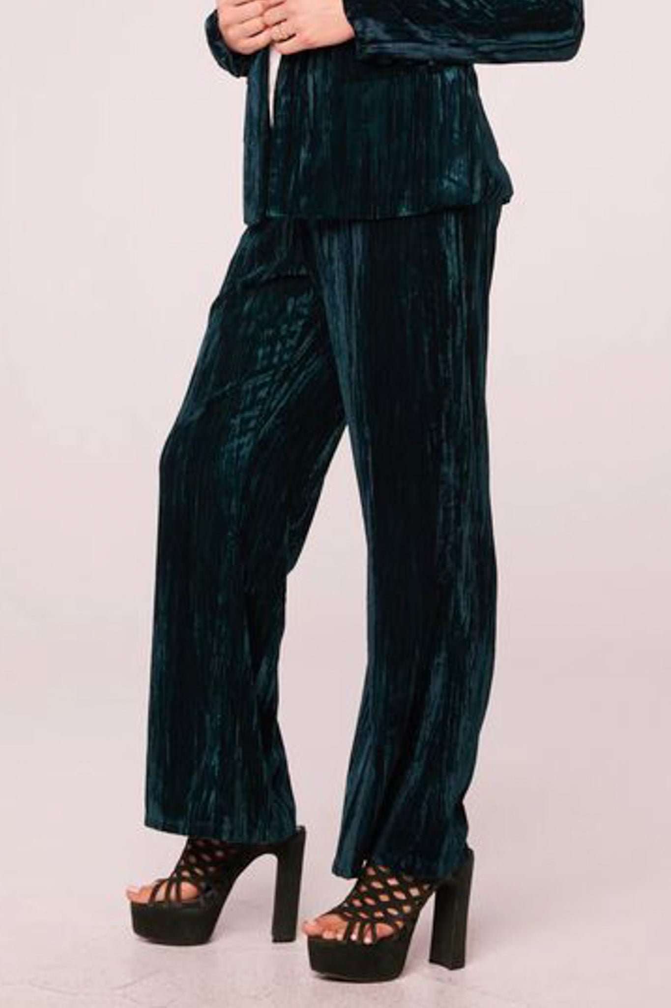 high-waisted pants in stunning deep pine green crushed velvet. pull-on pants feature a stretchy elastic waistband and retro-inspired wide leg fit. pants make a fun and different option for holiday wear. but can be worn more casually paired with a graphic tee.?