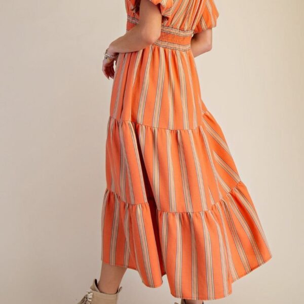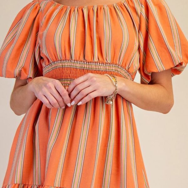 lightweight and comfortable dress in colorful tangerine stripes. dress features a wide round neckline. short puff sleeves. a stretchy smocked waistband. side pockets. and a tiered midi length skirt. dress can be styled casually or dressed up with heels and jewelry for a variety of looks this spring and summer.?