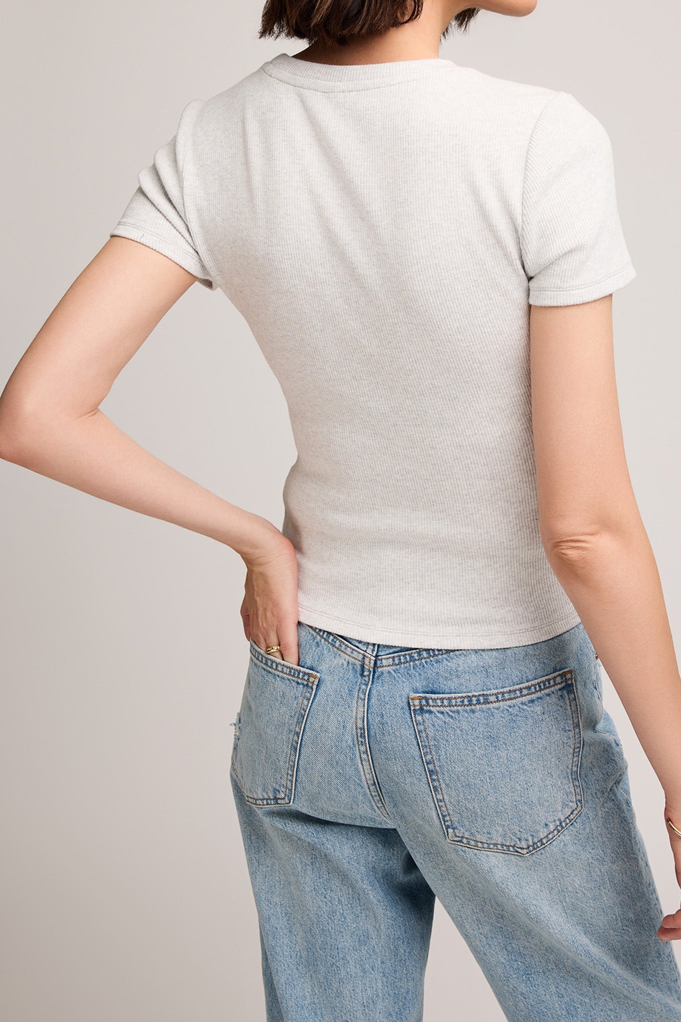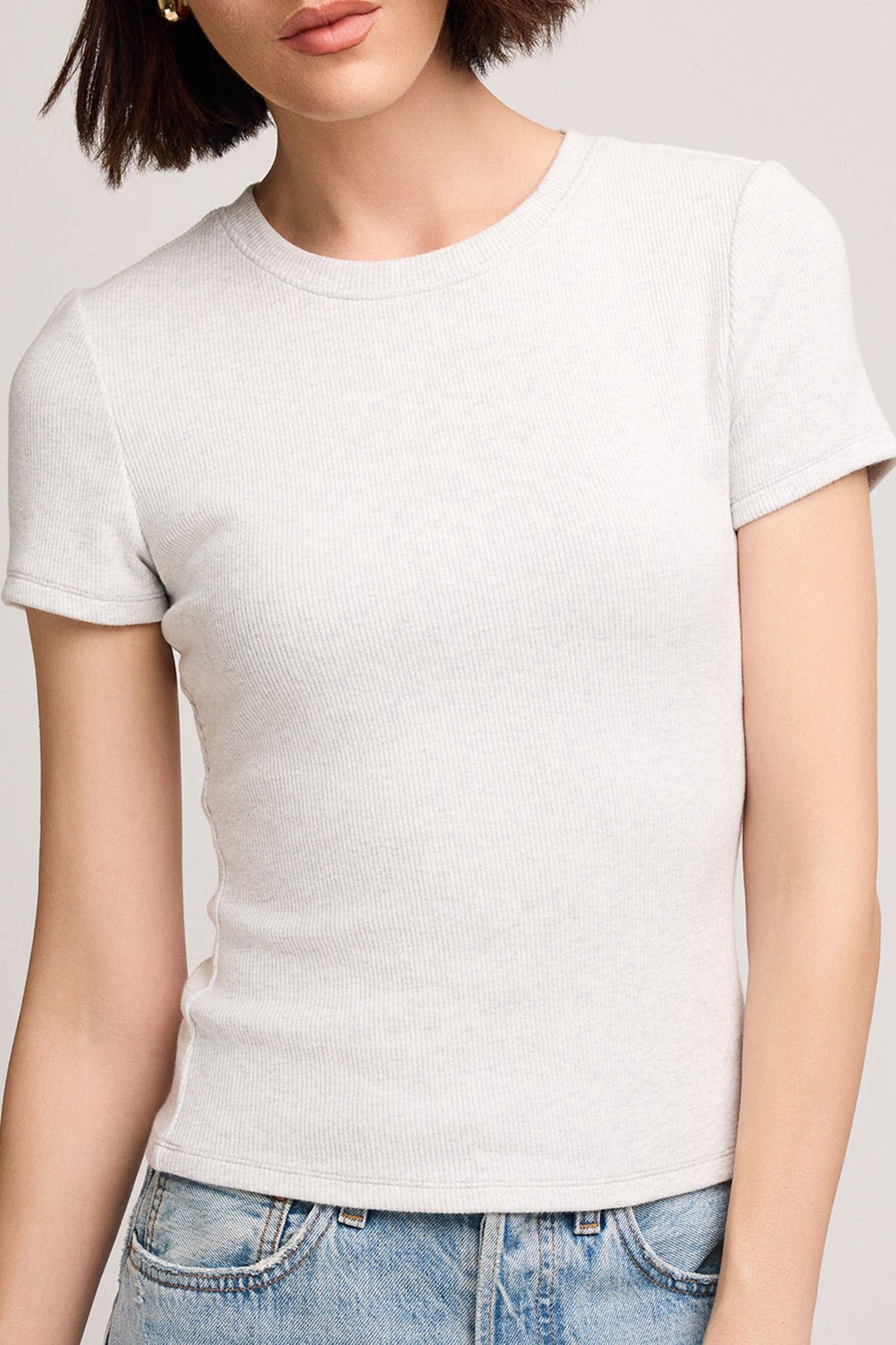 comfortable and soft midweight cotton blend tee in light heather grey. ribbed tee features a crew neckline and a contour fit. easy to wear tee feels nice against the skin and is an essential layering piece you’ll reach for all fall and winter.
