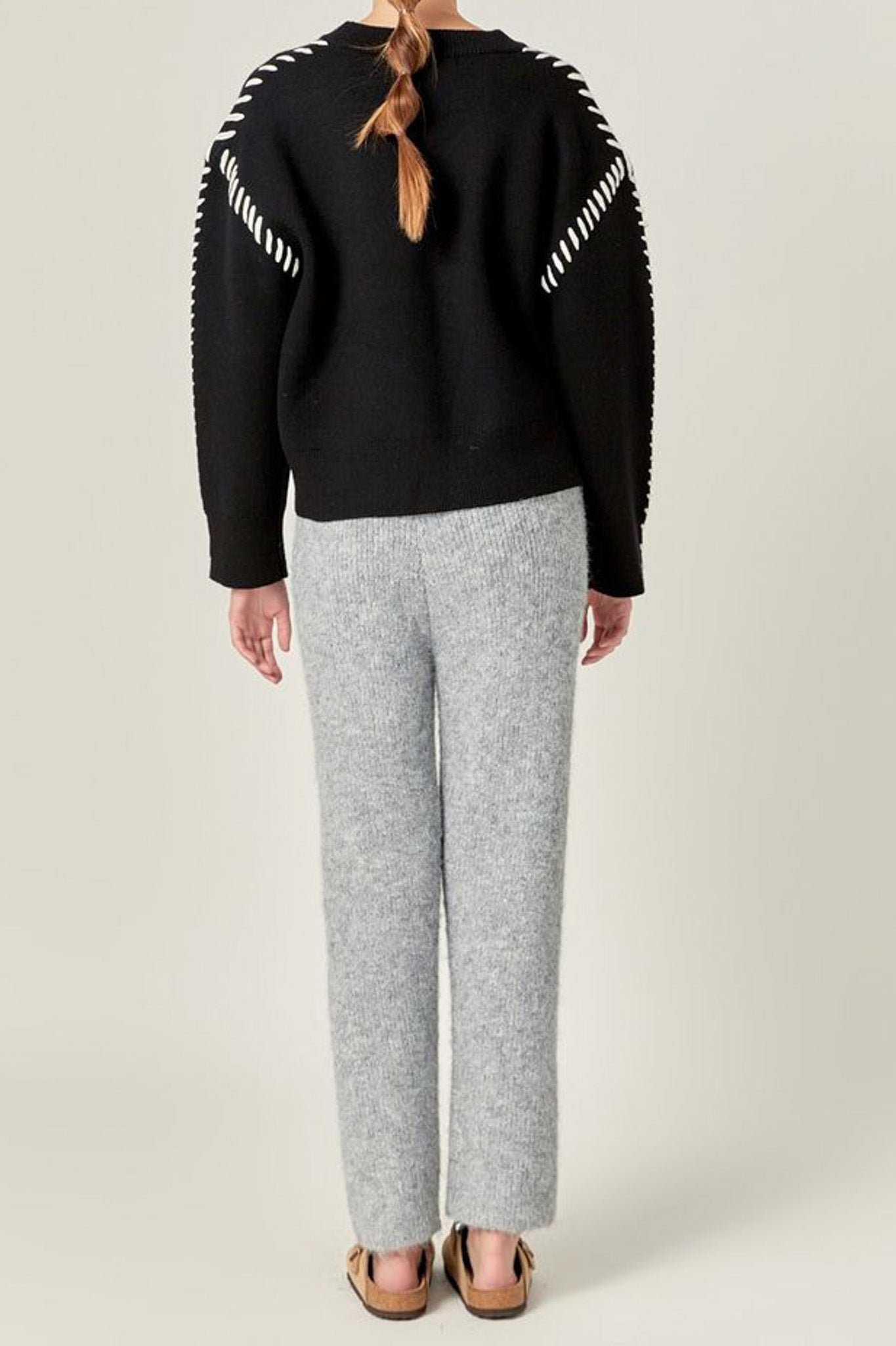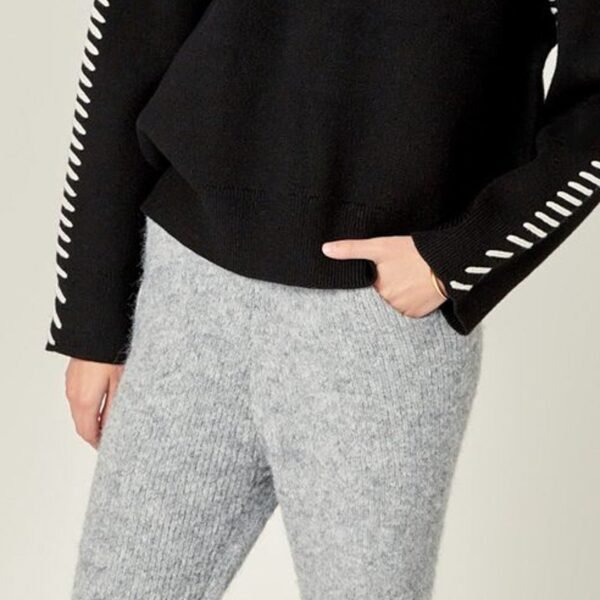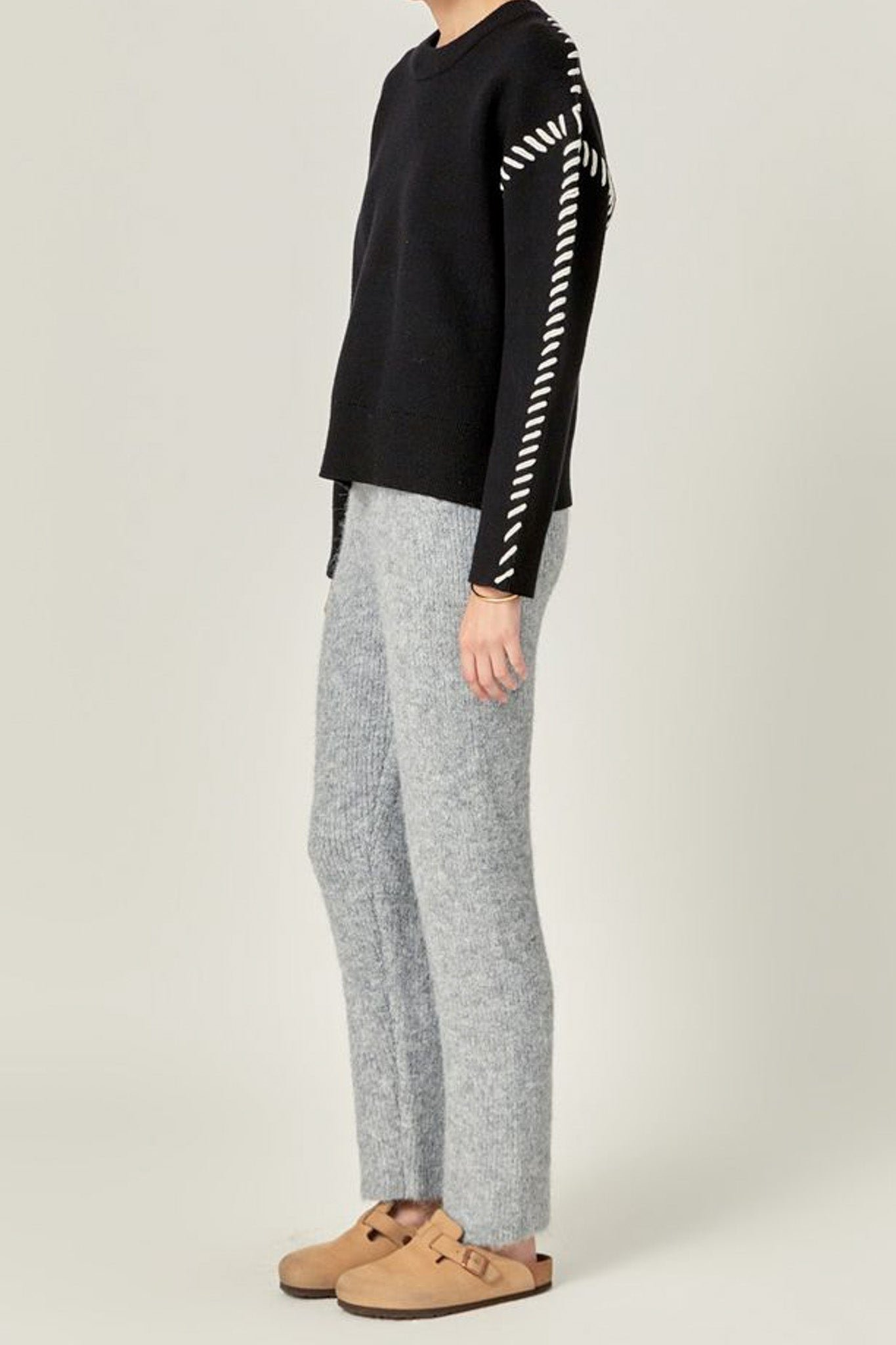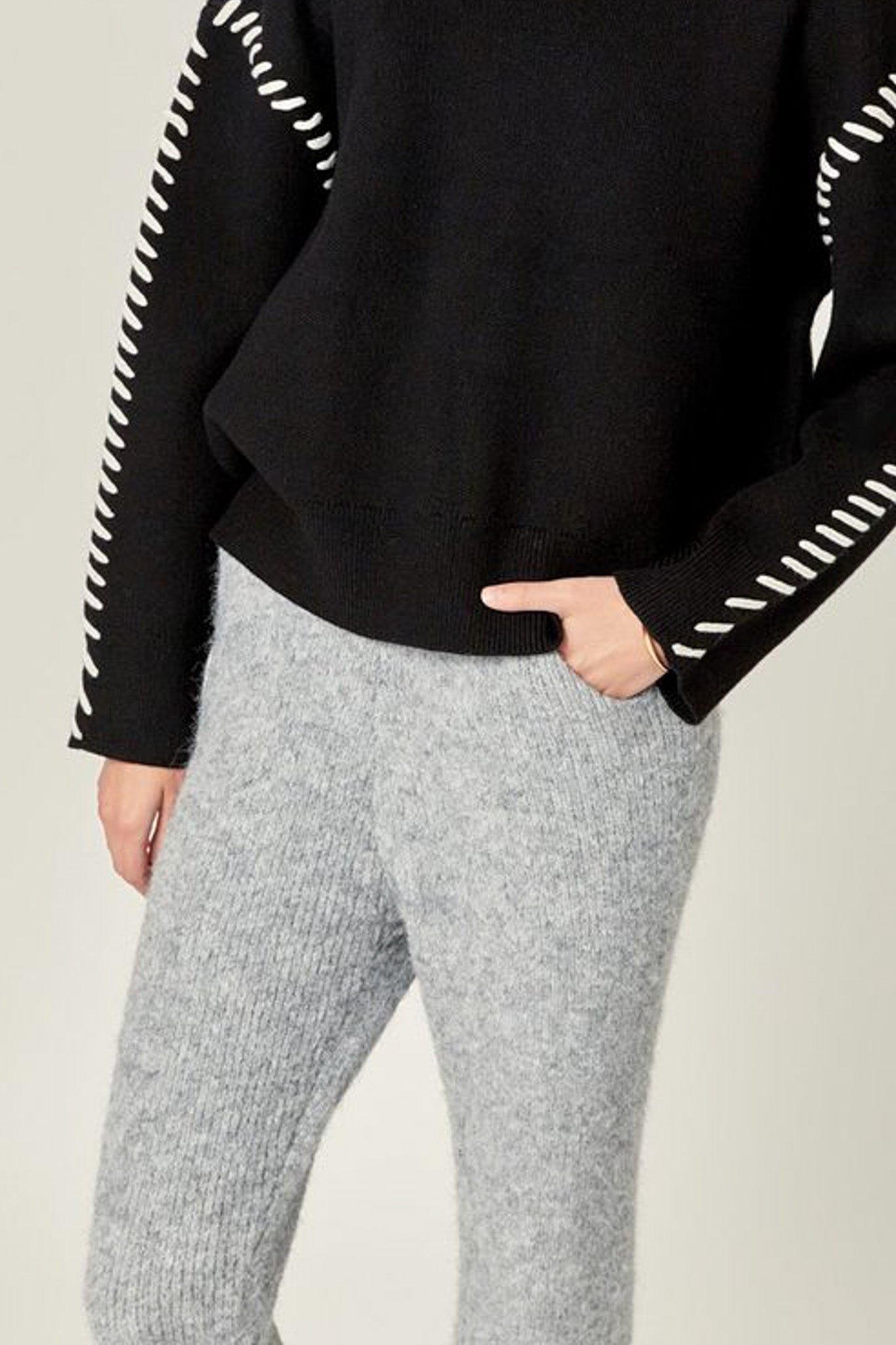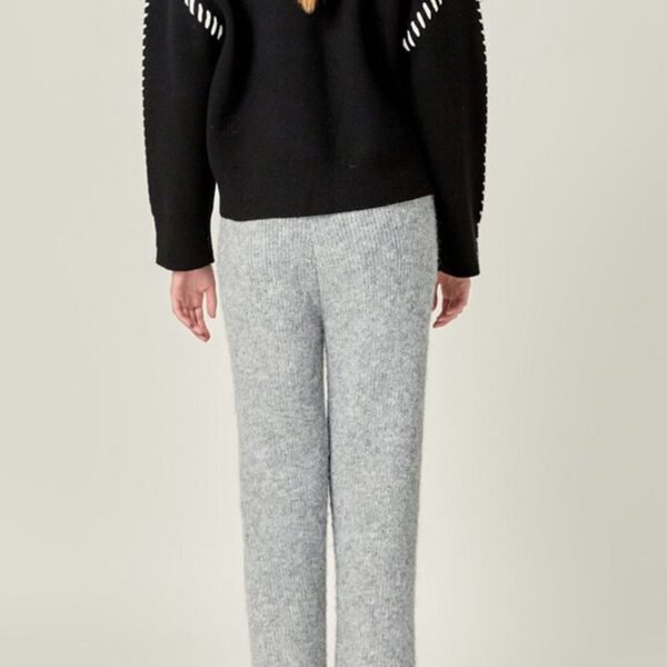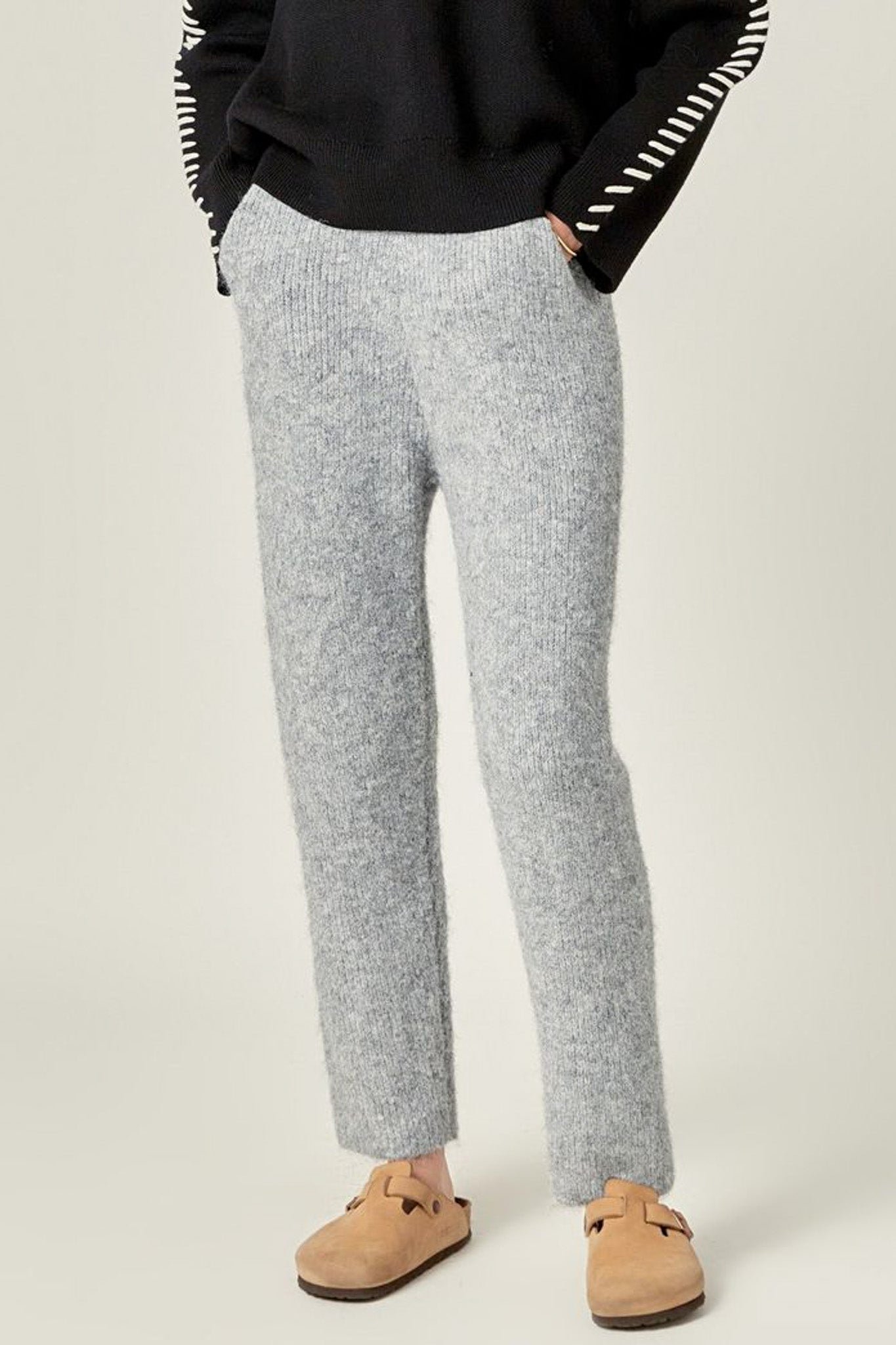 comfortable sweater joggers in classic heather grey. perfectly combining laid back style and comfort. these light and soft knit blend pants feature a high-waisted silhouette. stretchy elastic waistband. straight legs. and a relaxed fit. pair with the thunderstorm sweater for a cute. coordinated outfit or wear with your favorite tee or sweatshirt for a cozy and casual look.?