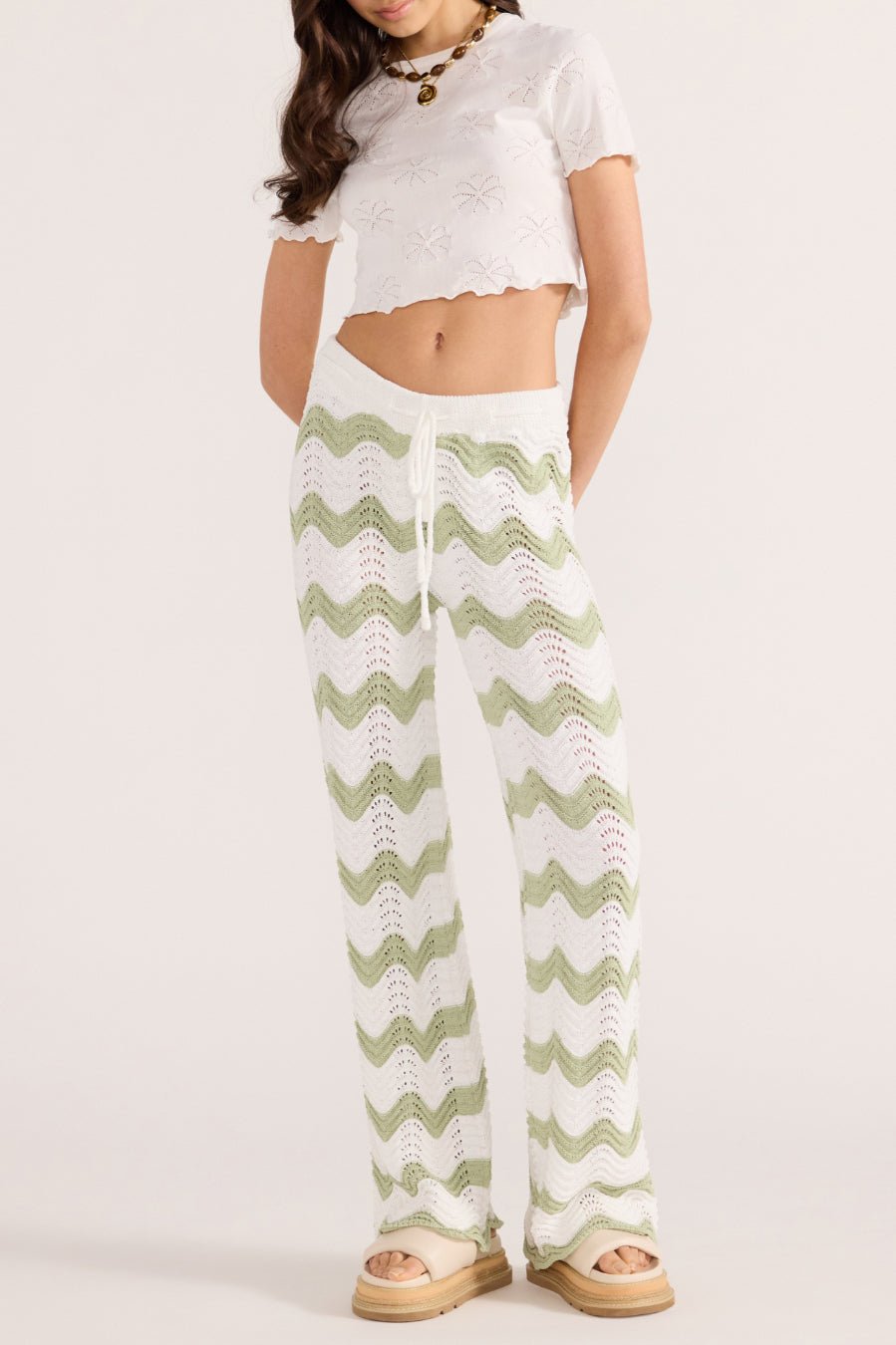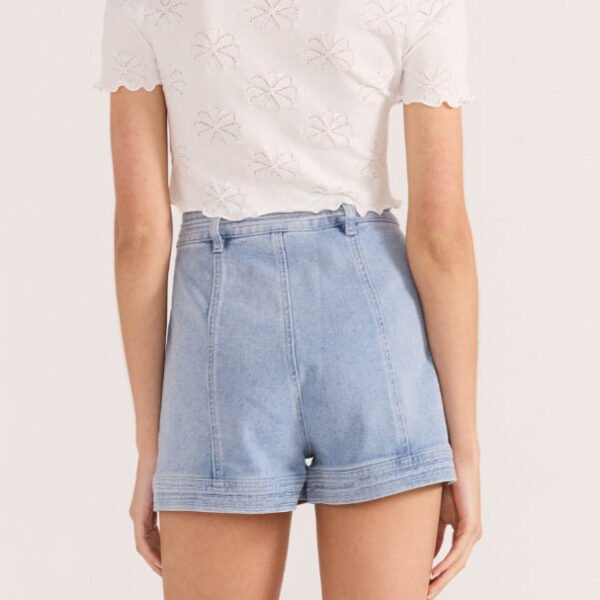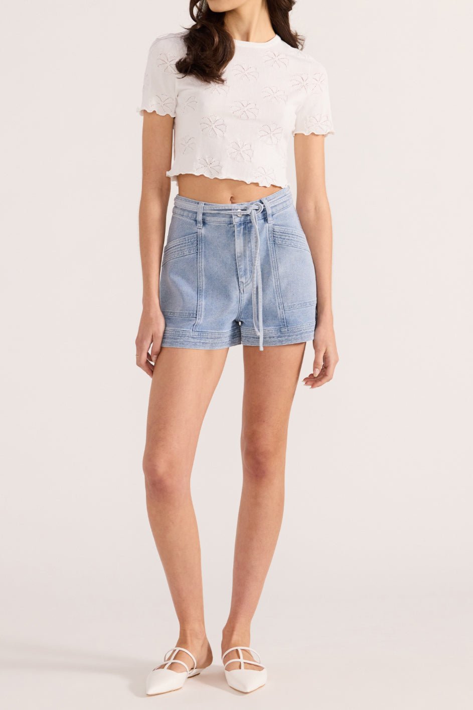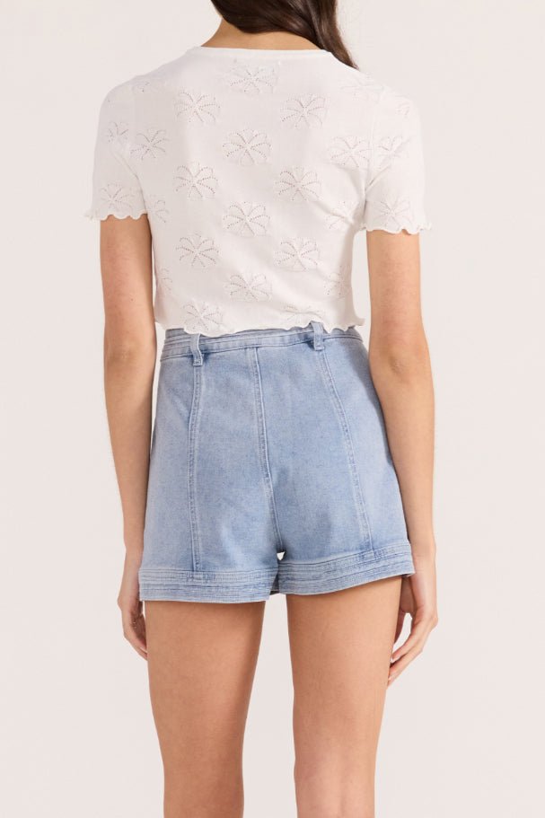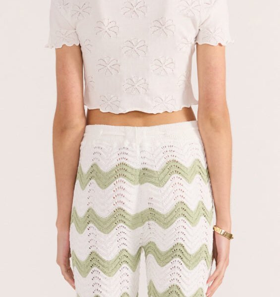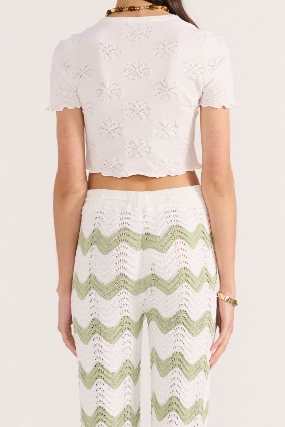 elevated white tee with sweet details. soft and comfortable cropped top has a shrunken. baby tee fit and features a crew neckline. short sleeves. ruffled lettuce edge hems. and lovely floral pointelle details throughout. versatile tee looks great with shorts. jeans. a skirt. or your favorite bottoms.?